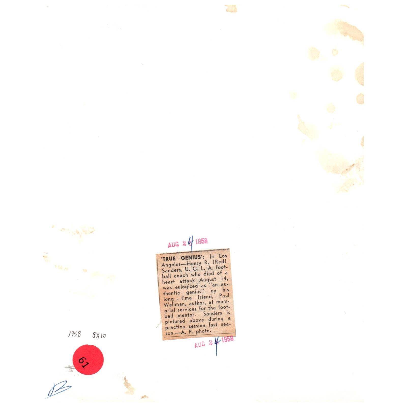 1958 Press Photo Football NCAA UCLA Coach Henry R. (Red) Sanders Dies 8x10" AD3