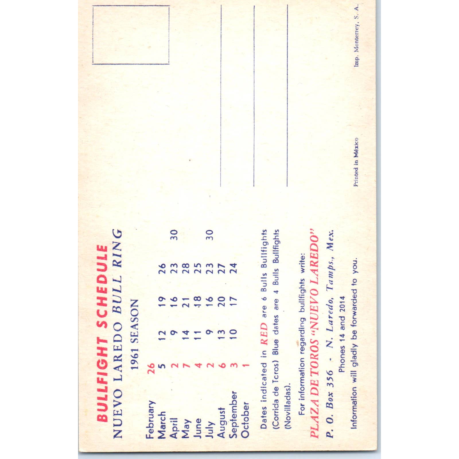 1961 Nuevo Laredo Bull Ring Bull Fight Schedule Original Postcard TK1-24