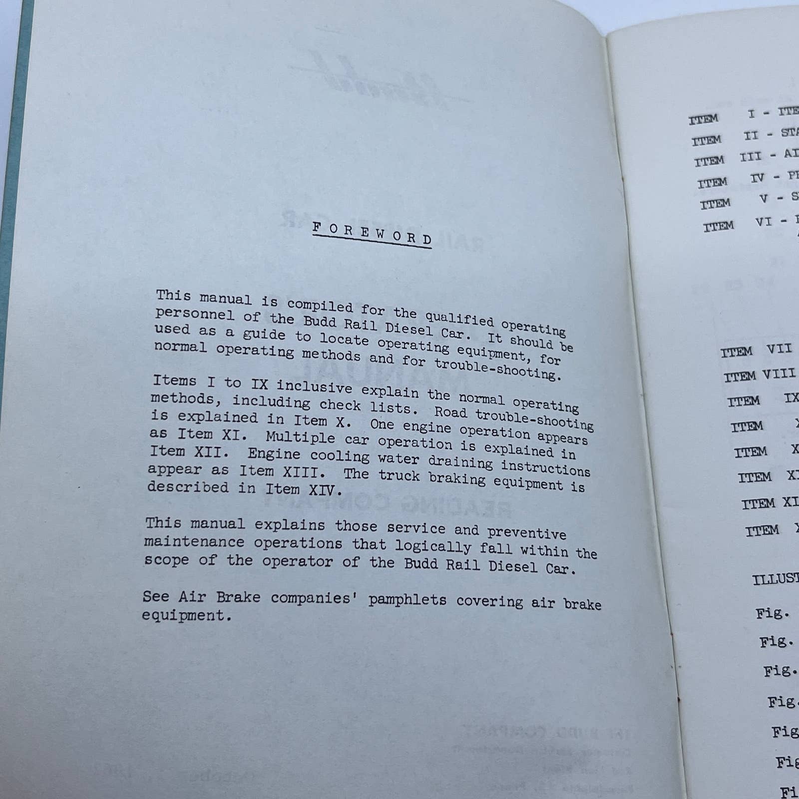 This manual is compiled for the qualified operating personnel of the Budd Rail Diesel Car. It should be used as a guide to locate operating equipment, for normal operating methods and for trouble-shooting.