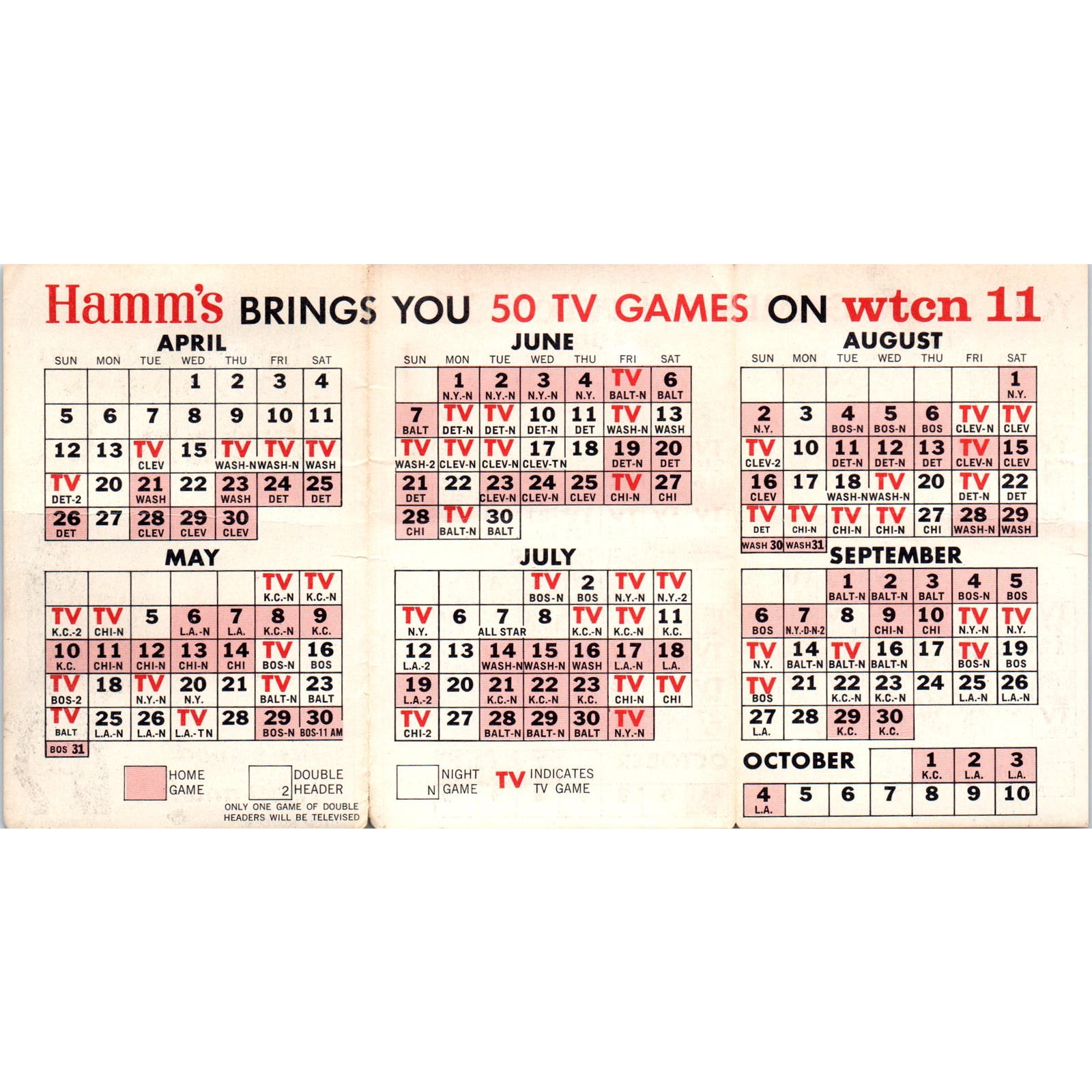 1964 Minnesota Twins Baseball Bear Hamms Pocket TV Schedule TK1-P3