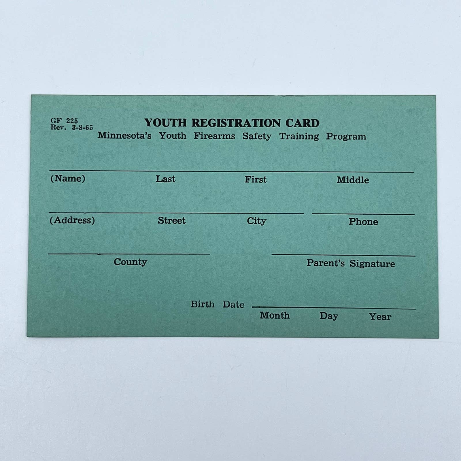 1965 Minnesota Youth Firearms Safety Training Program Registration Card SC9