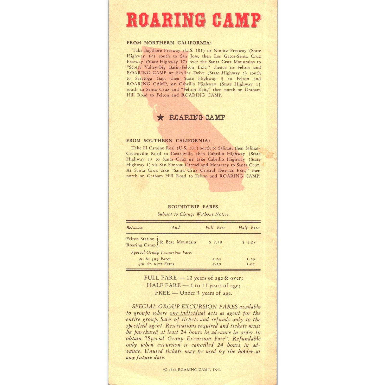 1966 Roaring Camp & Big Trees Narrow-Gauge Railroad Timetable Santa Cruz TH9-CB