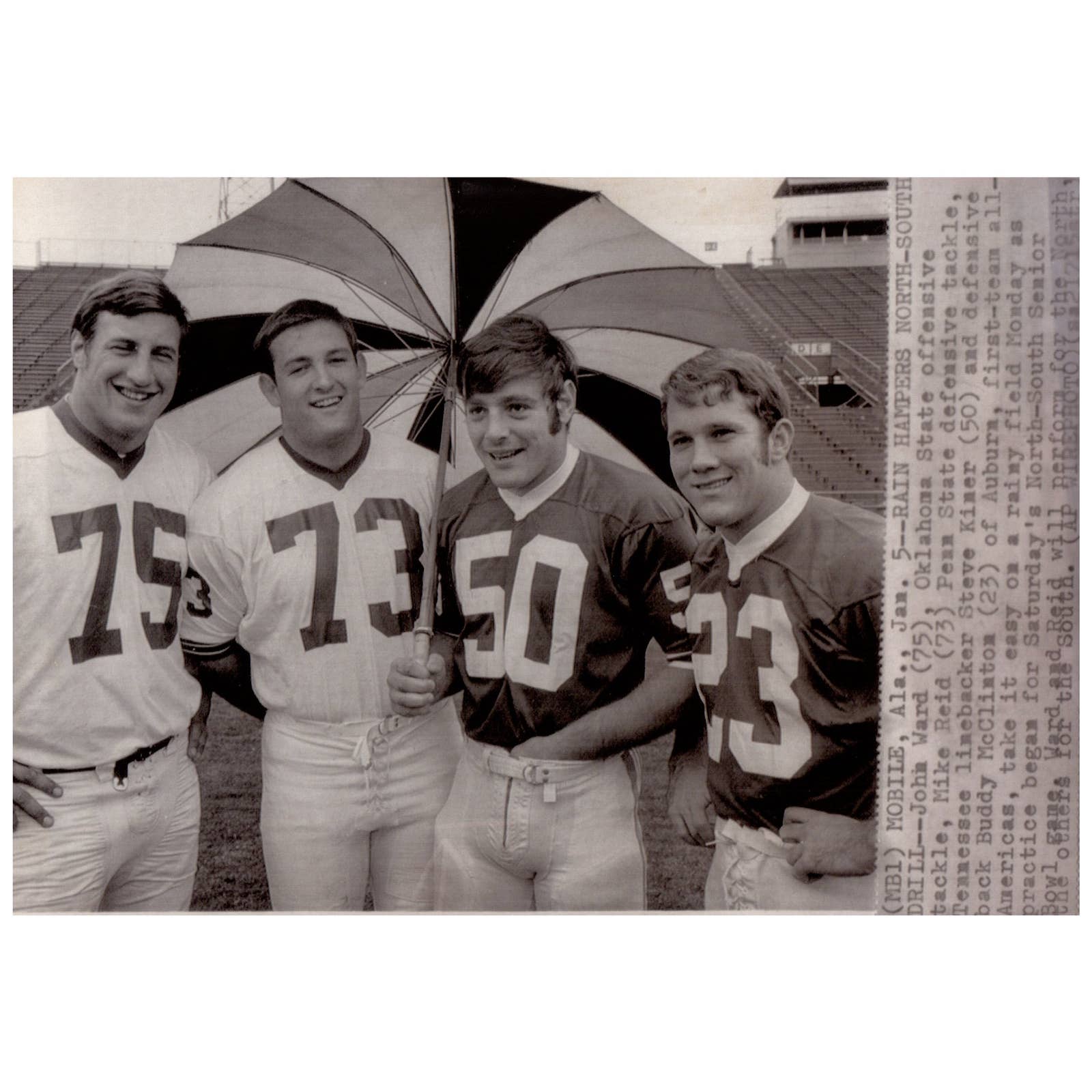 1970 Press Photo Football NCAA North South Senior Bowl Game Preparation - John Ward, Mike Reid, Steve Kiner, Buddy McClinton 7x9" AD3
