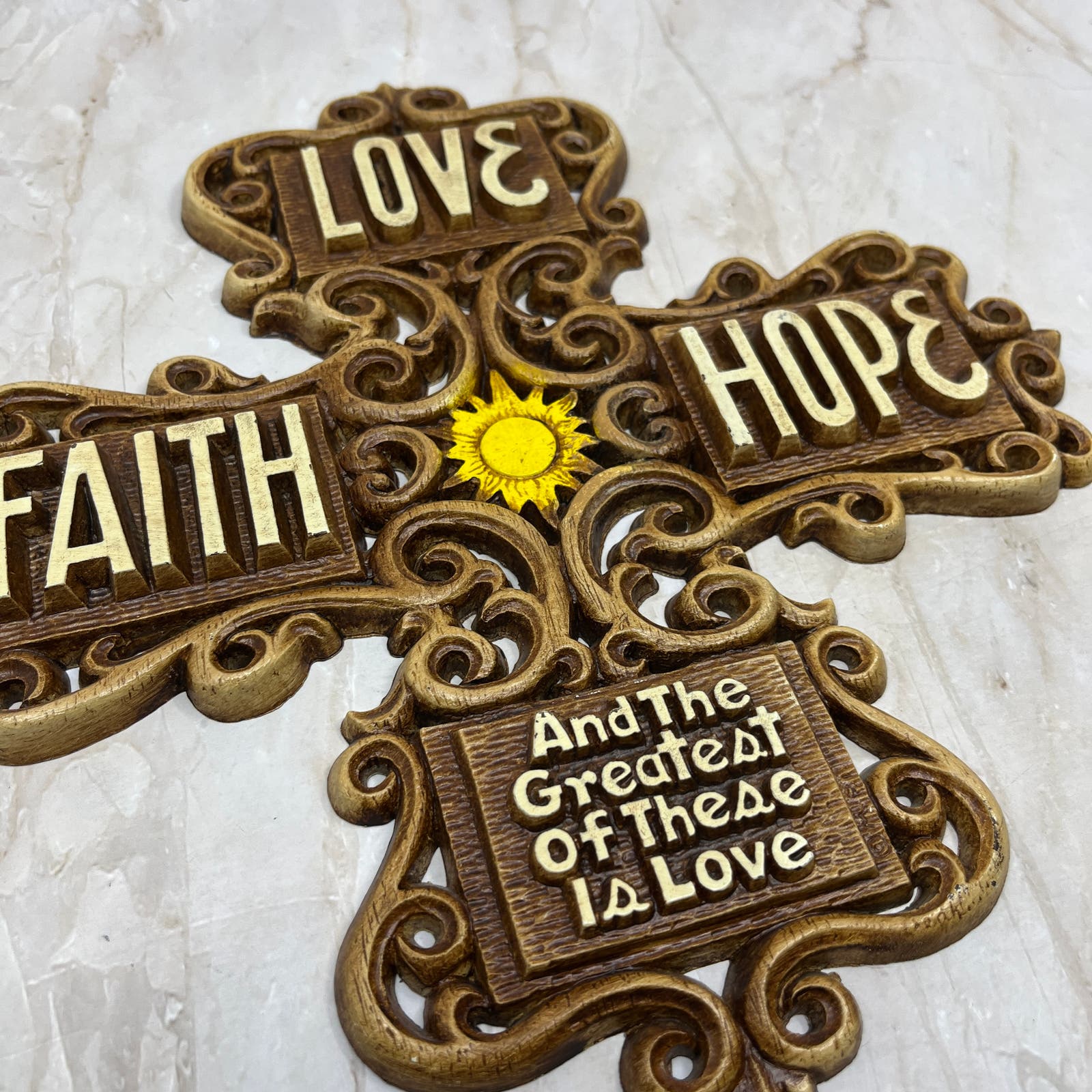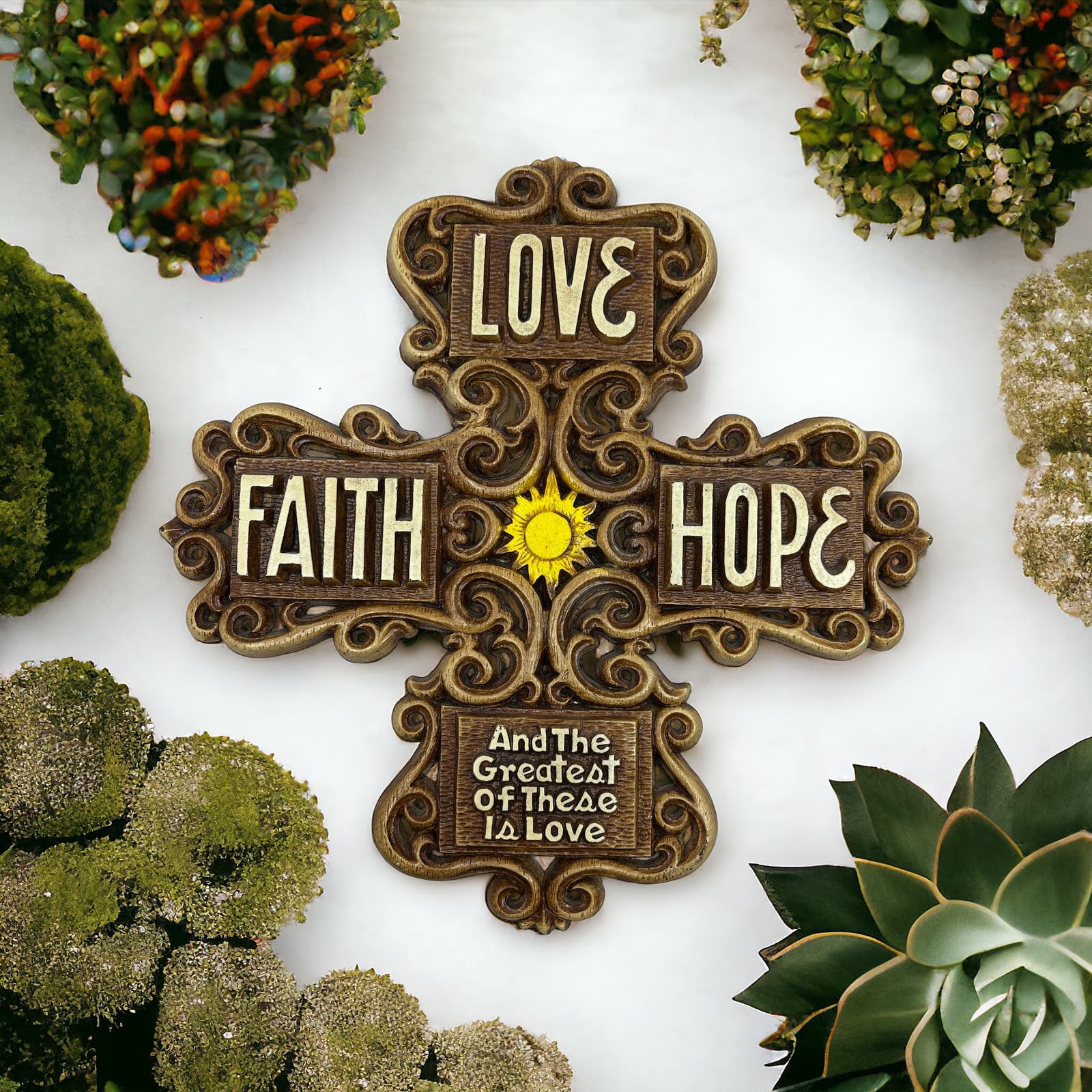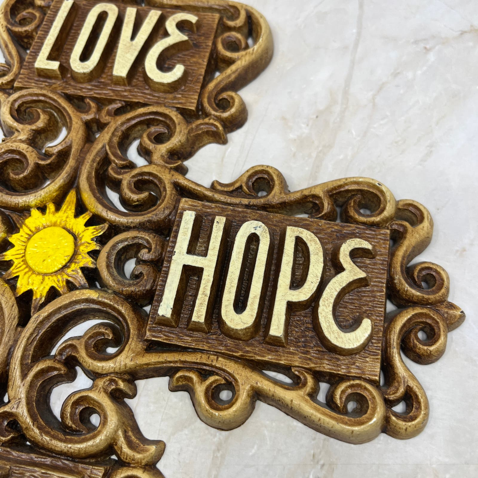 1970s Kitsch Cross Love Faith Hope Wall Plaque Multi-Products Resin 11” TD5