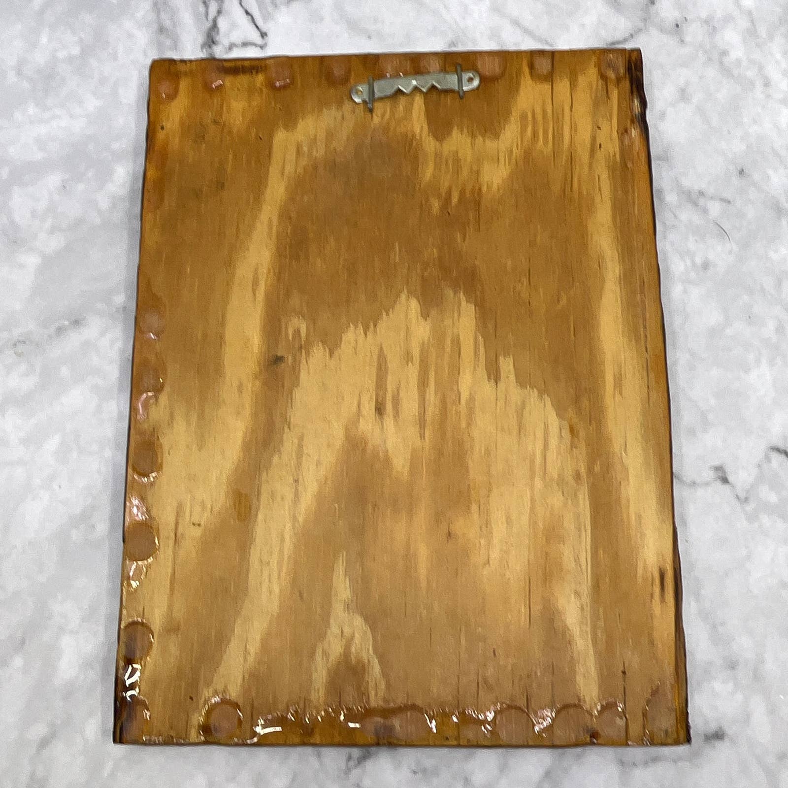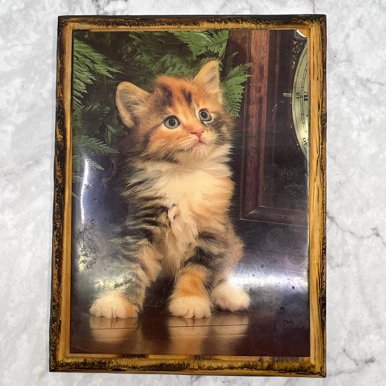 1970s Kitsch Wood Lacquered Mounted Decor Picture Calico Kitten 6x8" TI7