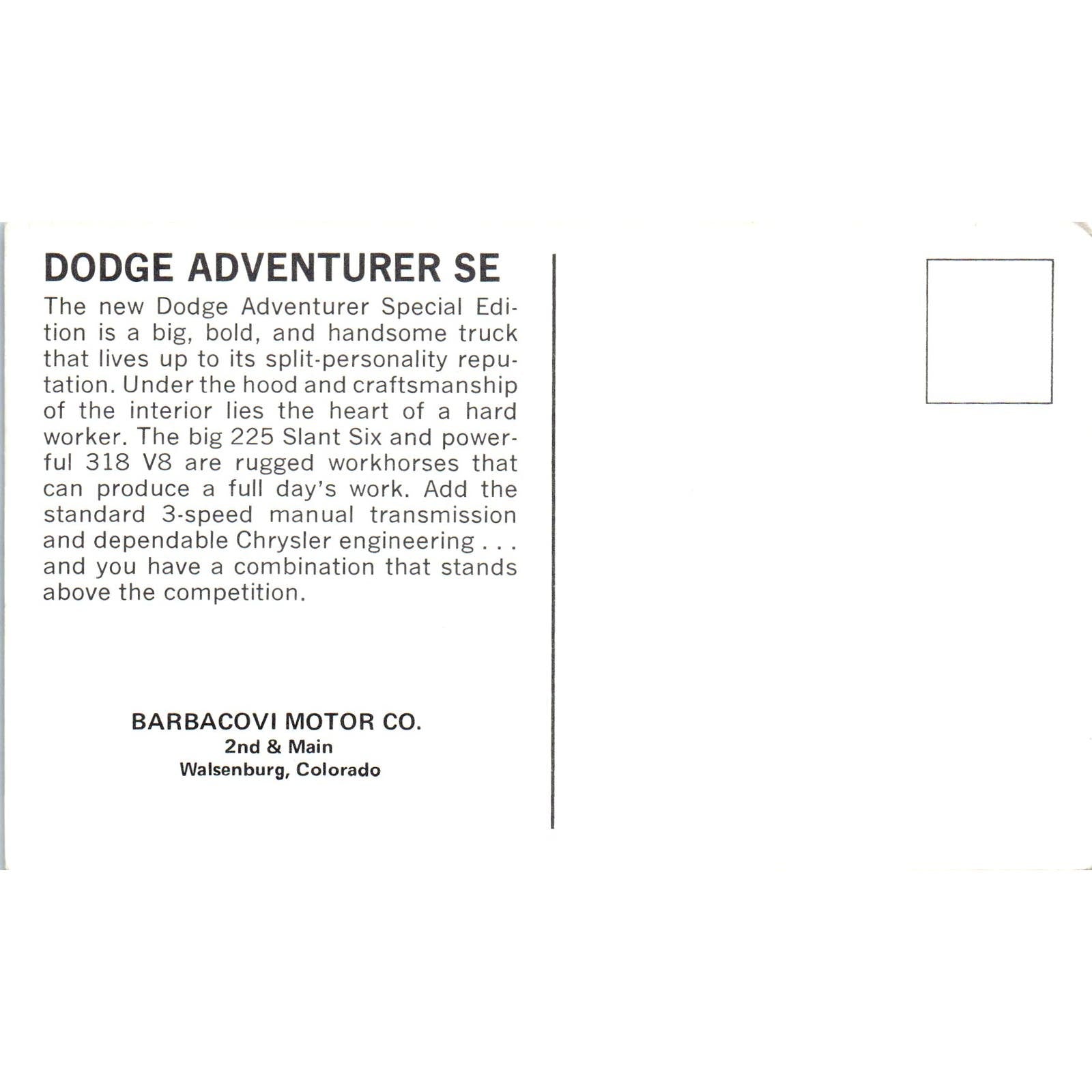 1971 Dodge Adventurer SE Pickup truck Barbacovi Motor Co Walsenburg CO Vintage Postcard PC12
