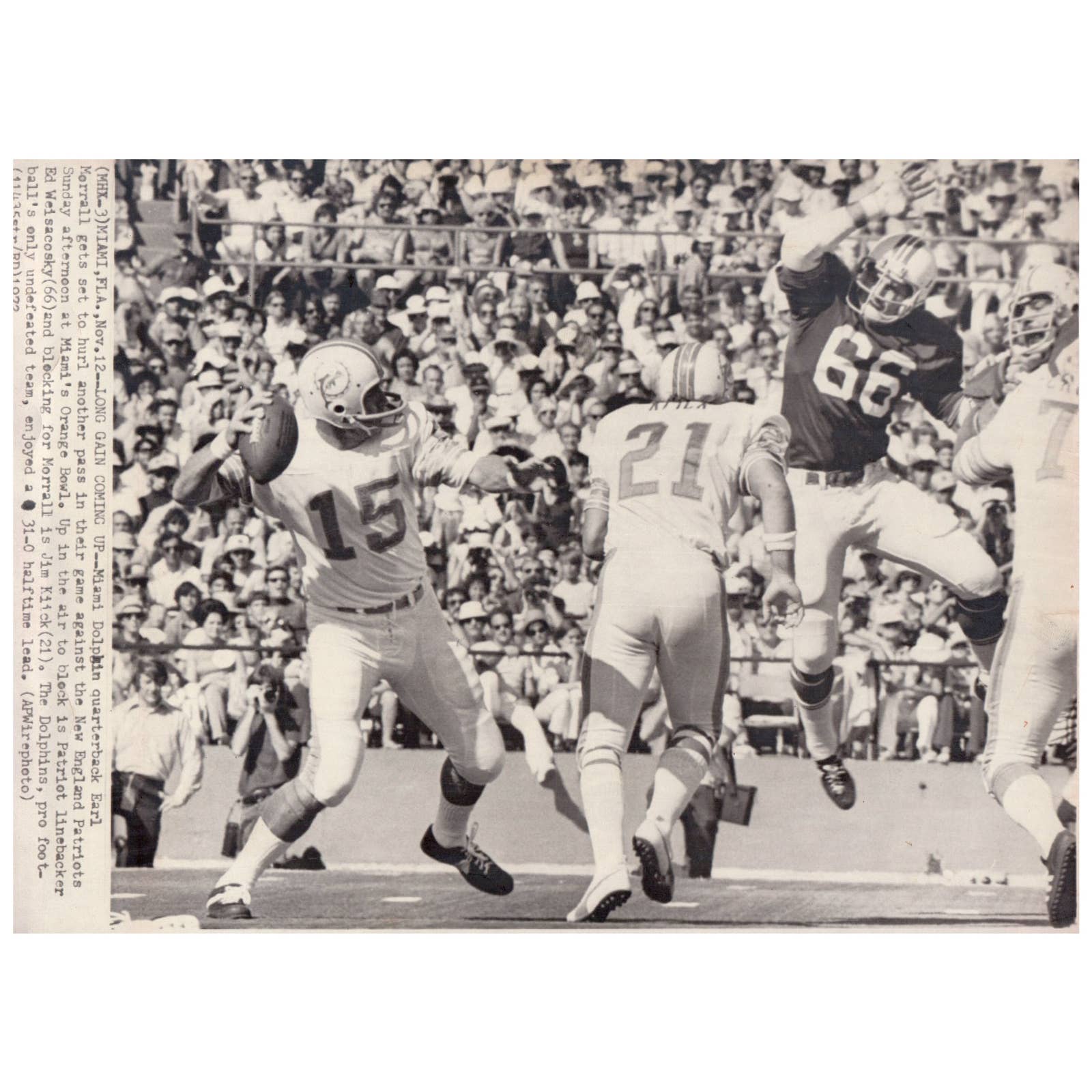 1972 Press Photo Football Miami Dolphins Quarterback Earl Morrall Pass, Jim Kiick blocking Patriots Linebacker Ed Weisacosky - FROM UNDEFEATED SEASON 7x10" AD3