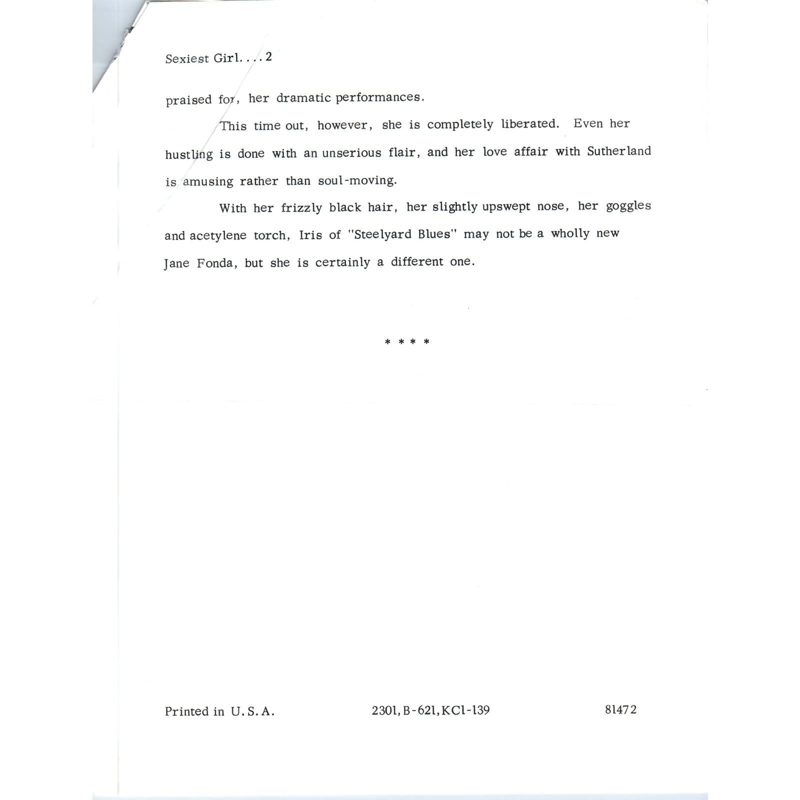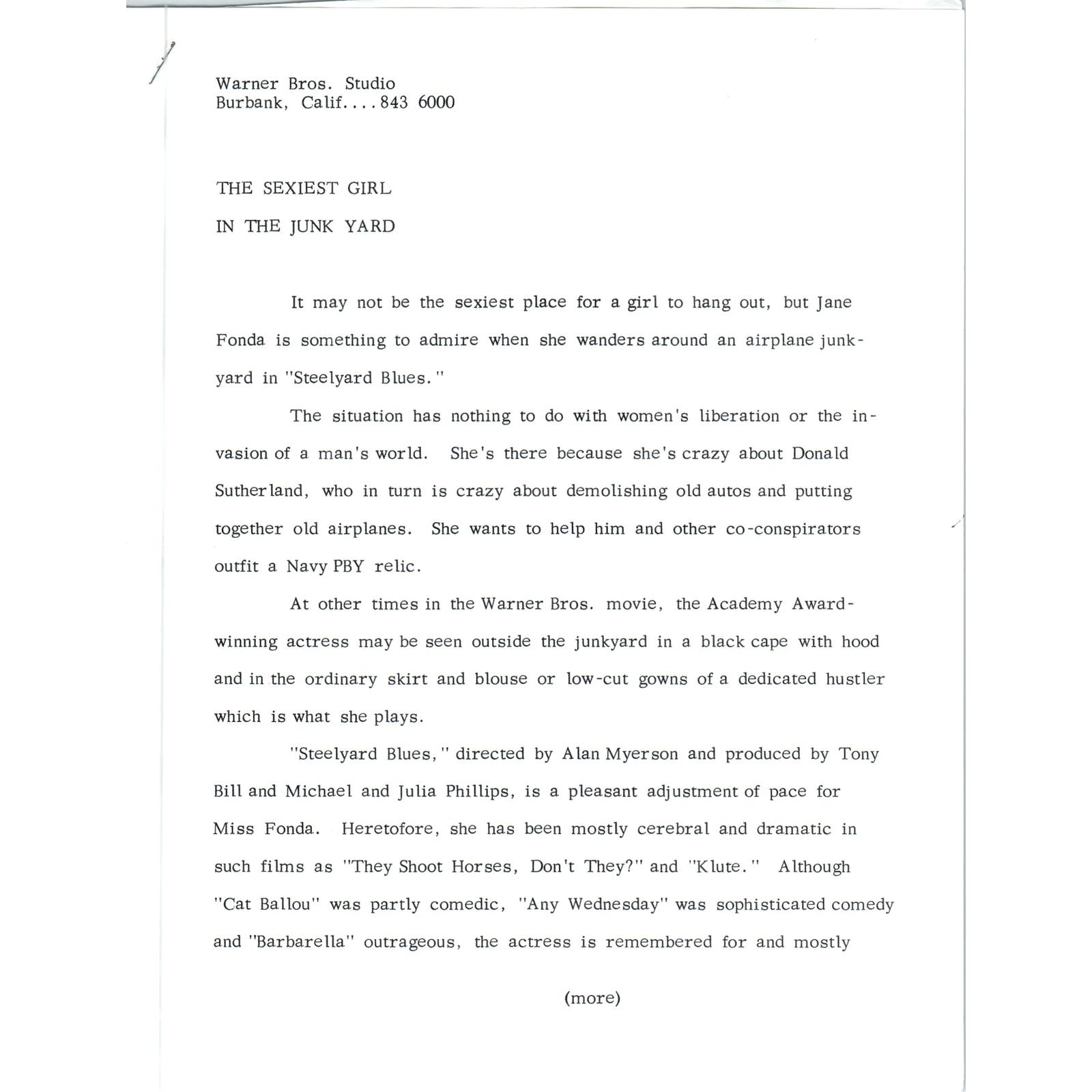 1972 Warner Bros. Studios Jane Fonda Steelyard Blues Promo Sheet Sexiest Girl in the Junkyard AE7