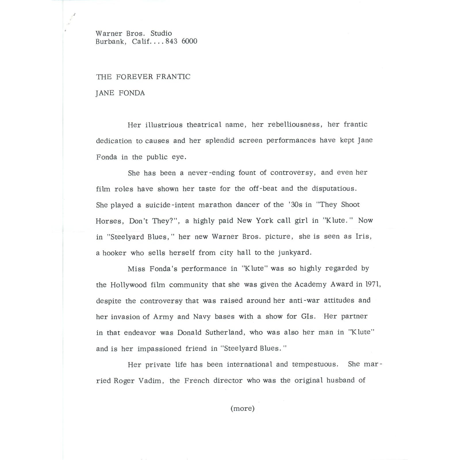 1972 Warner Bros. Studios Jane Fonda Steelyard Blues Promo Sheet Forever Frantic AE7
