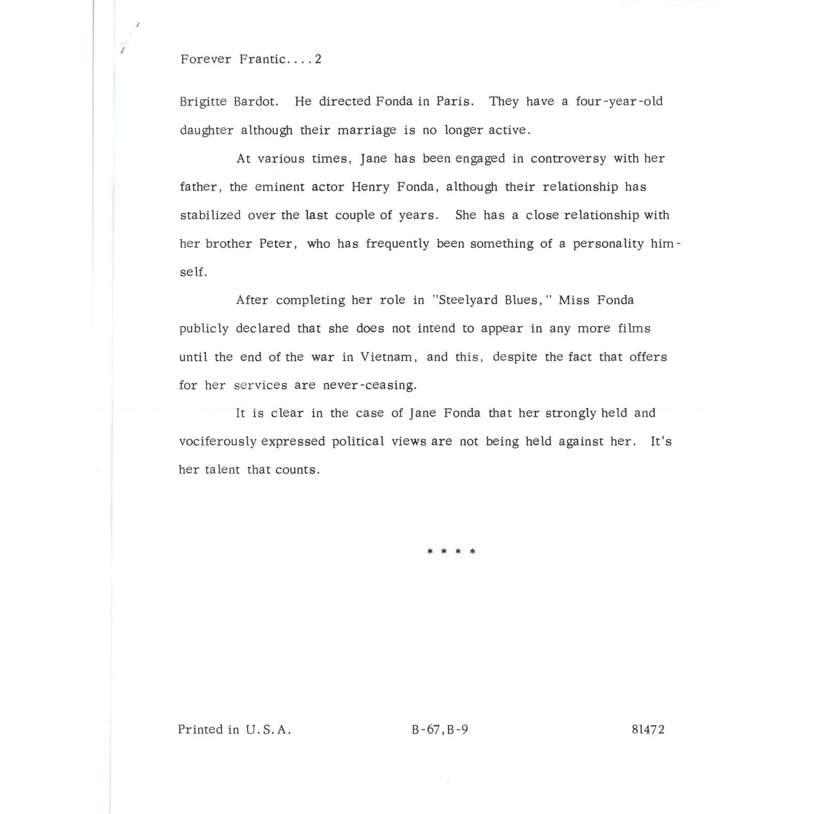 1972 Warner Bros. Studios Jane Fonda Steelyard Blues Promo Forever Frantic AE7