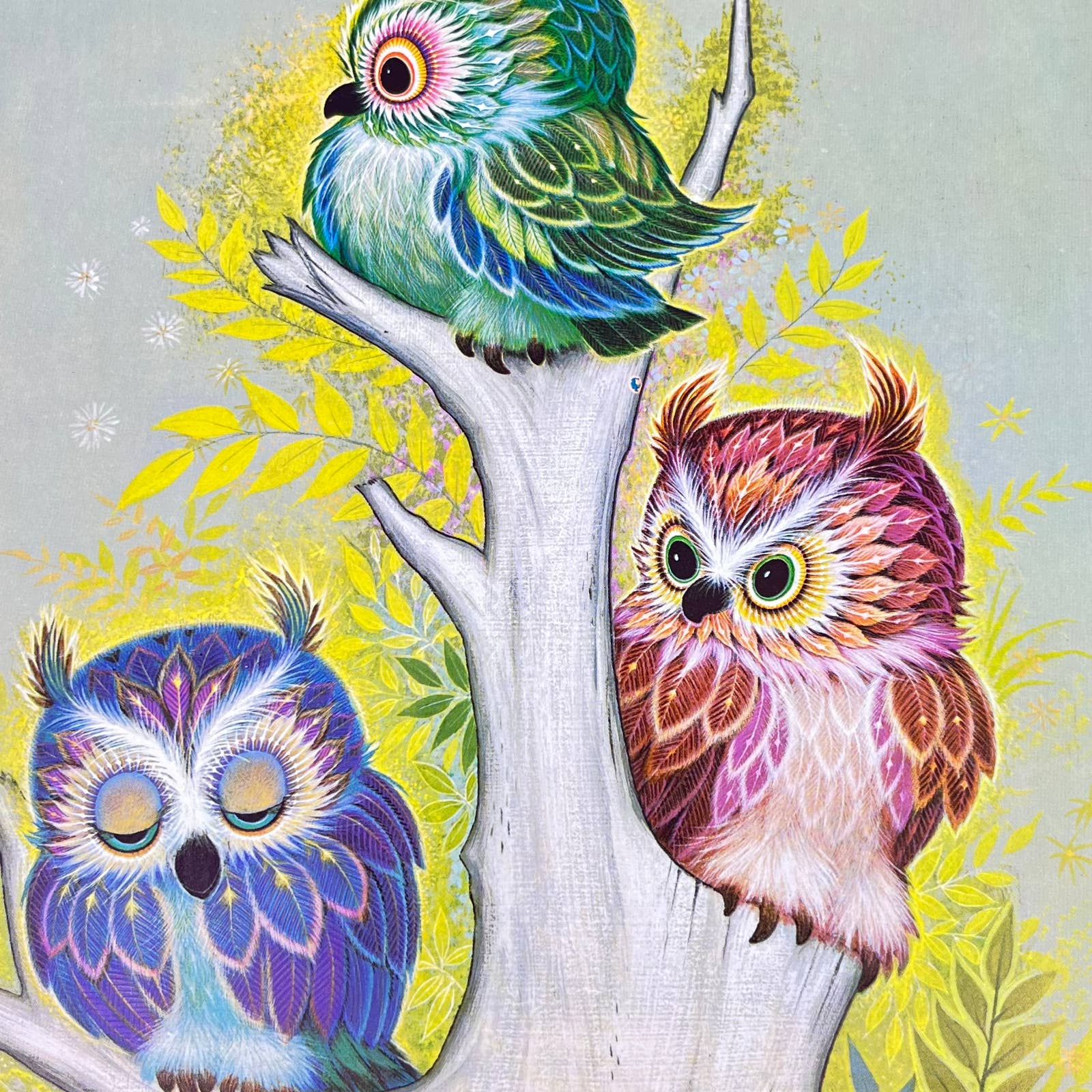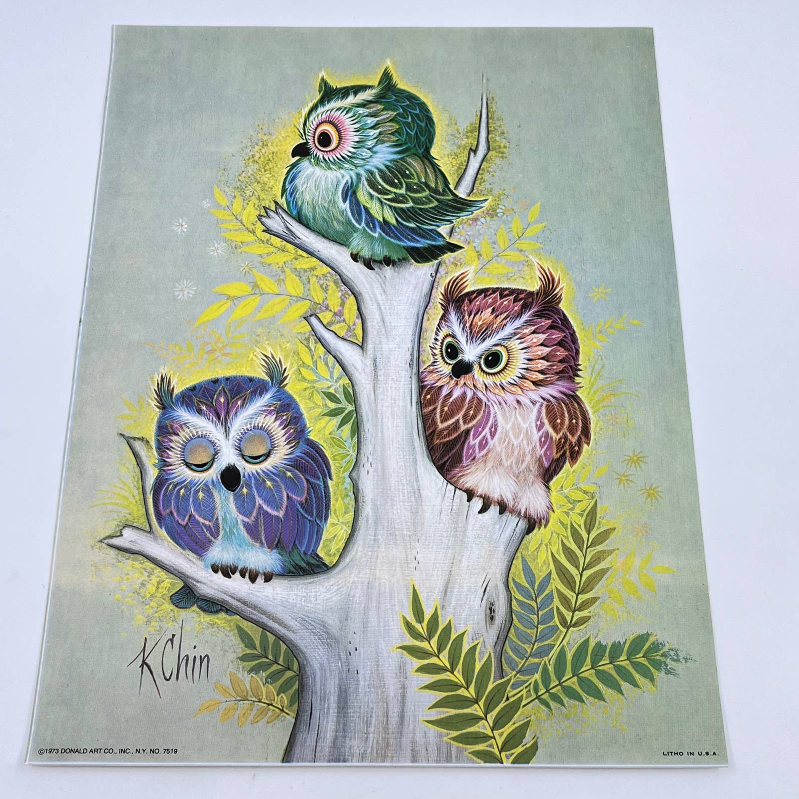 1973 Kitschy Donald Art Co. 3 Owls in a Tree Lithograph K Chin 9 x 12” FL3