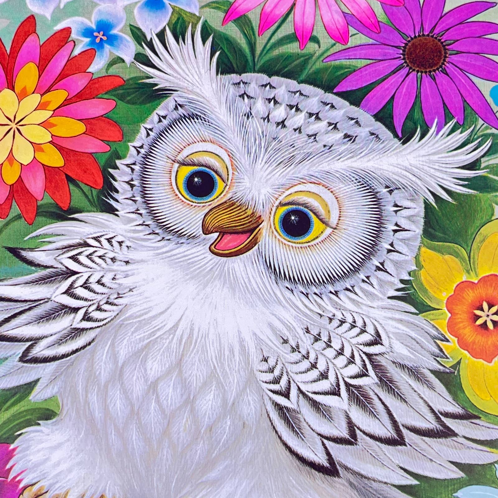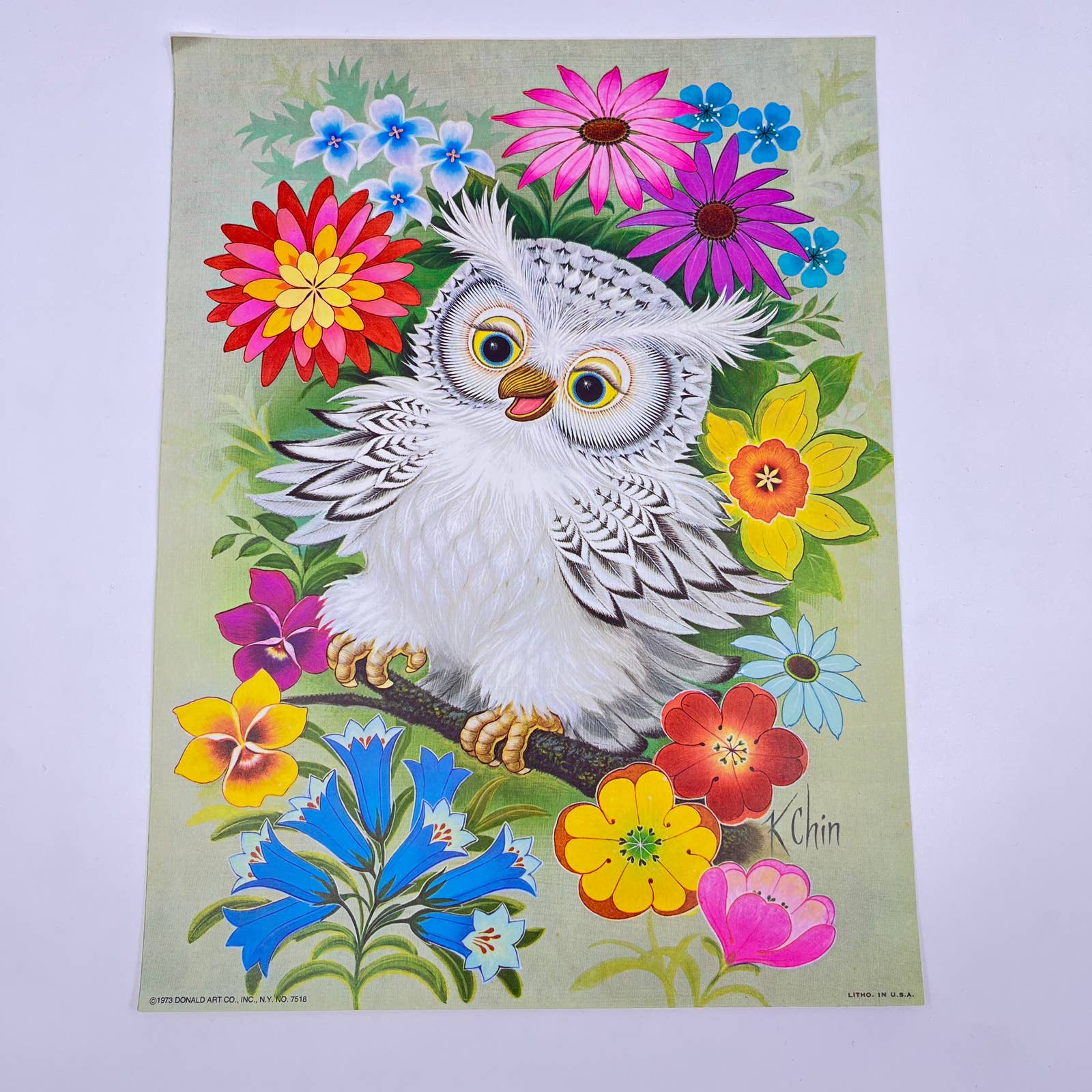 1973 Kitschy Donald Art Co. Owl & Flowers Lithograph K Chin 9 x 12” FL3