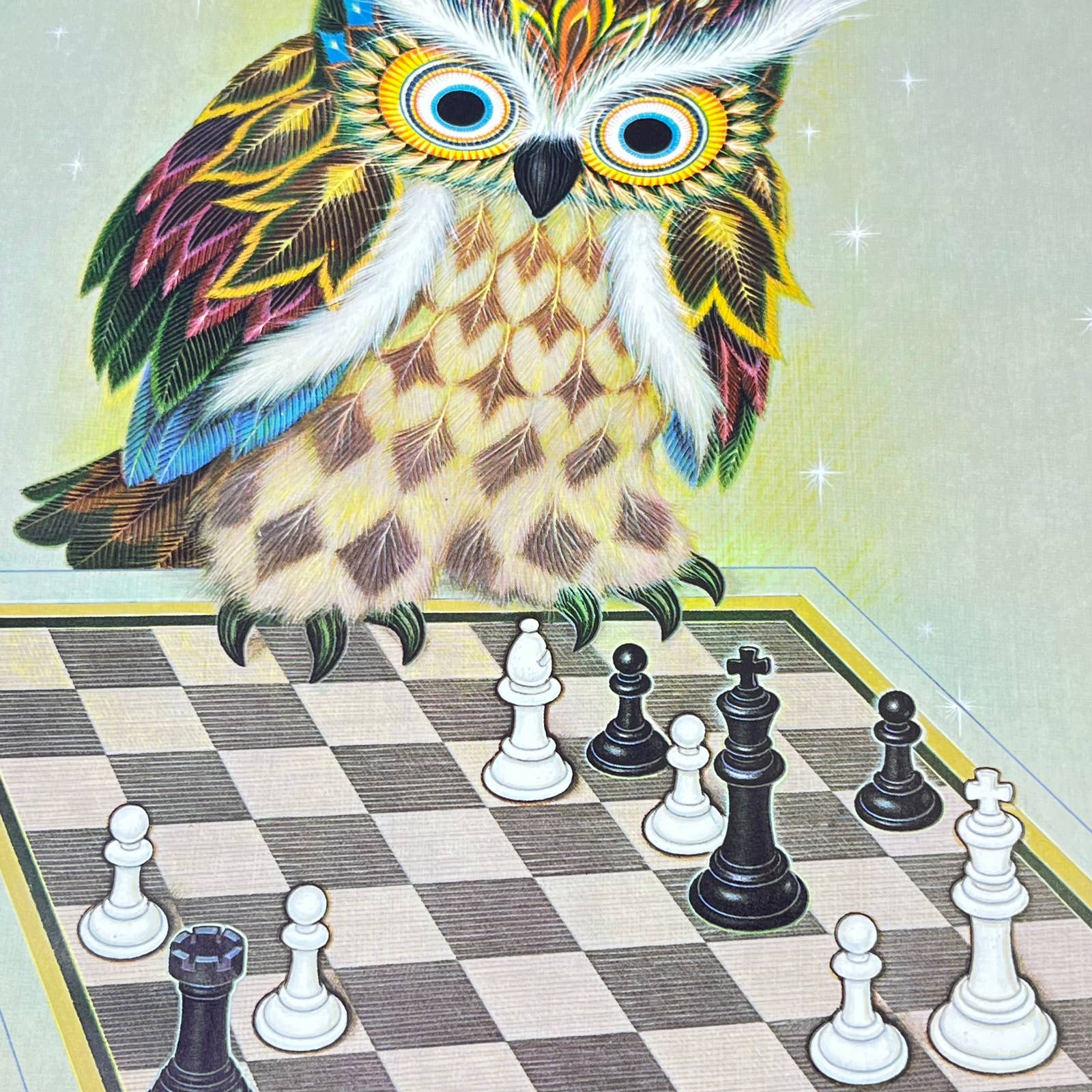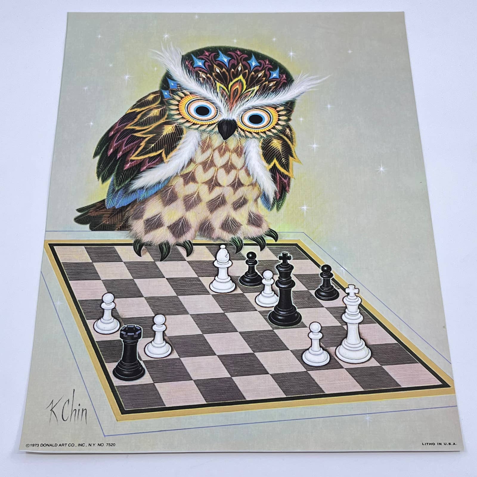 1973 Kitschy Donald Art Co. Owl Playing Chess Lithograph K Chin 9 x 12” FL3