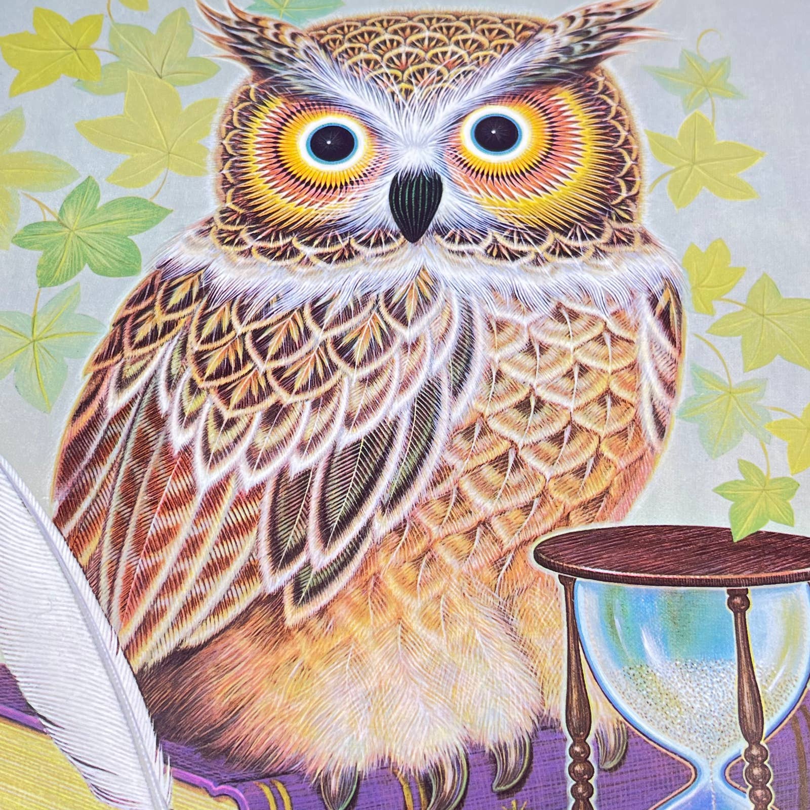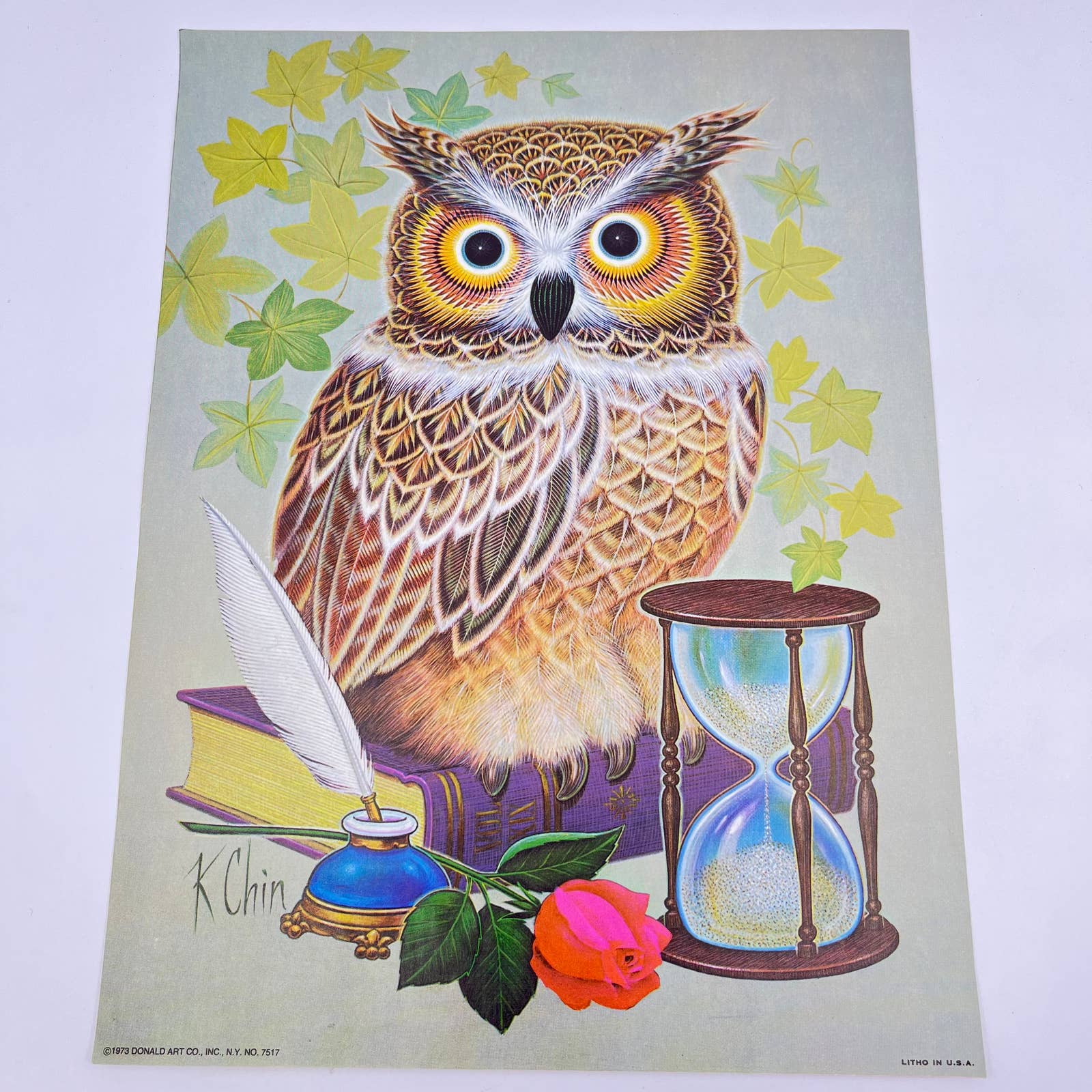1973 Kitschy Donald Art Co. Owl With Hourglass Lithograph K Chin 9 x 12” FL3
