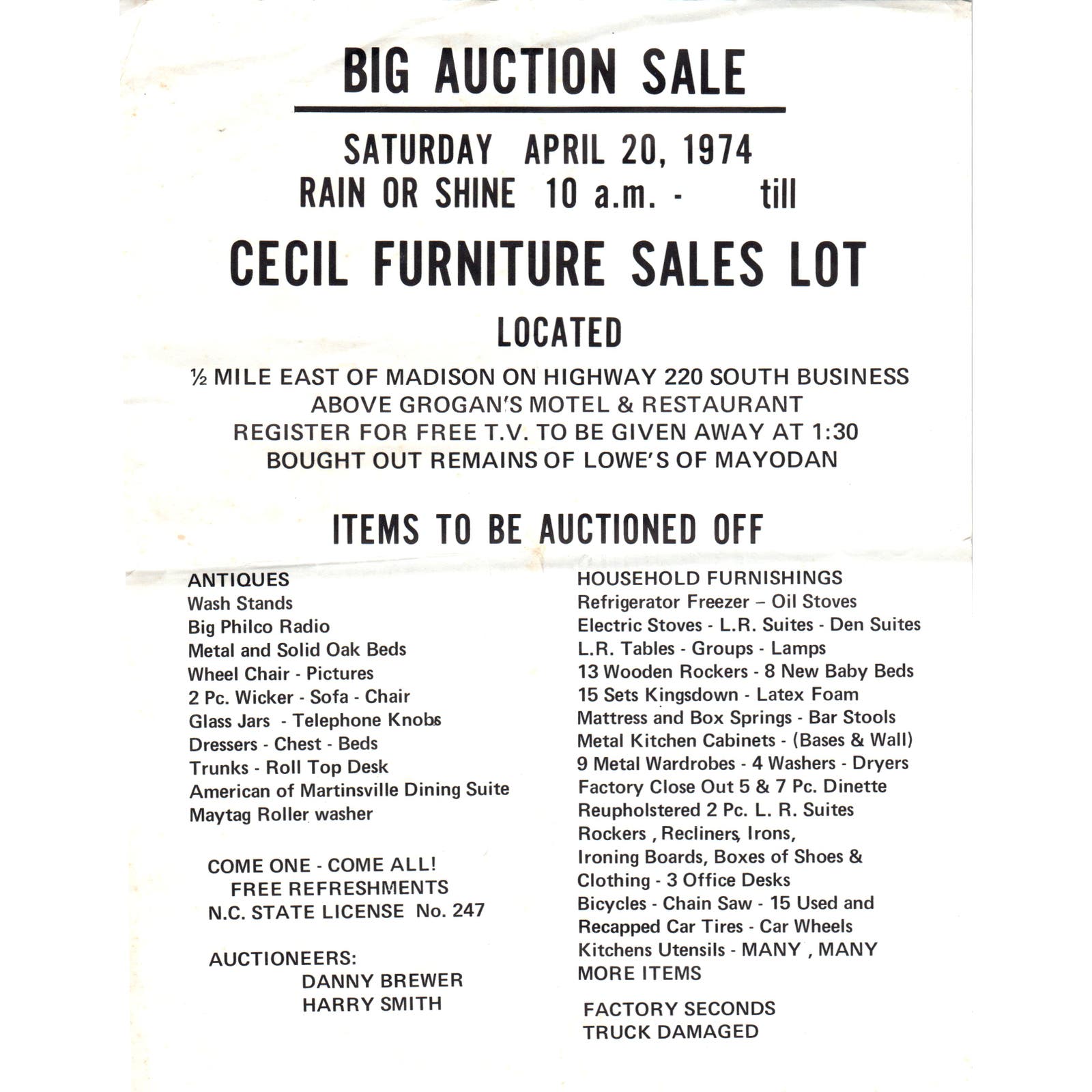 1974 Auction Bulletin Cecil Furniture Sales Lot Madison NC Danny Brewer Harry Smith AF1-RR6