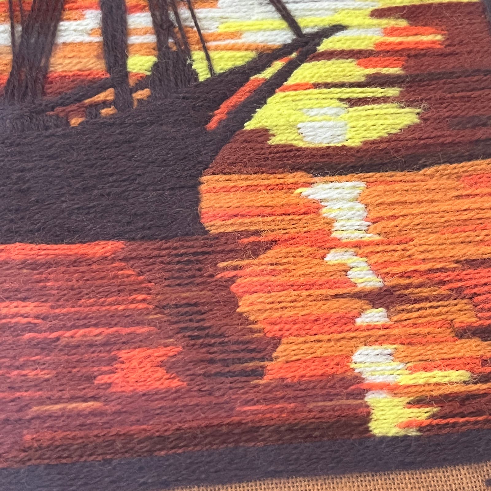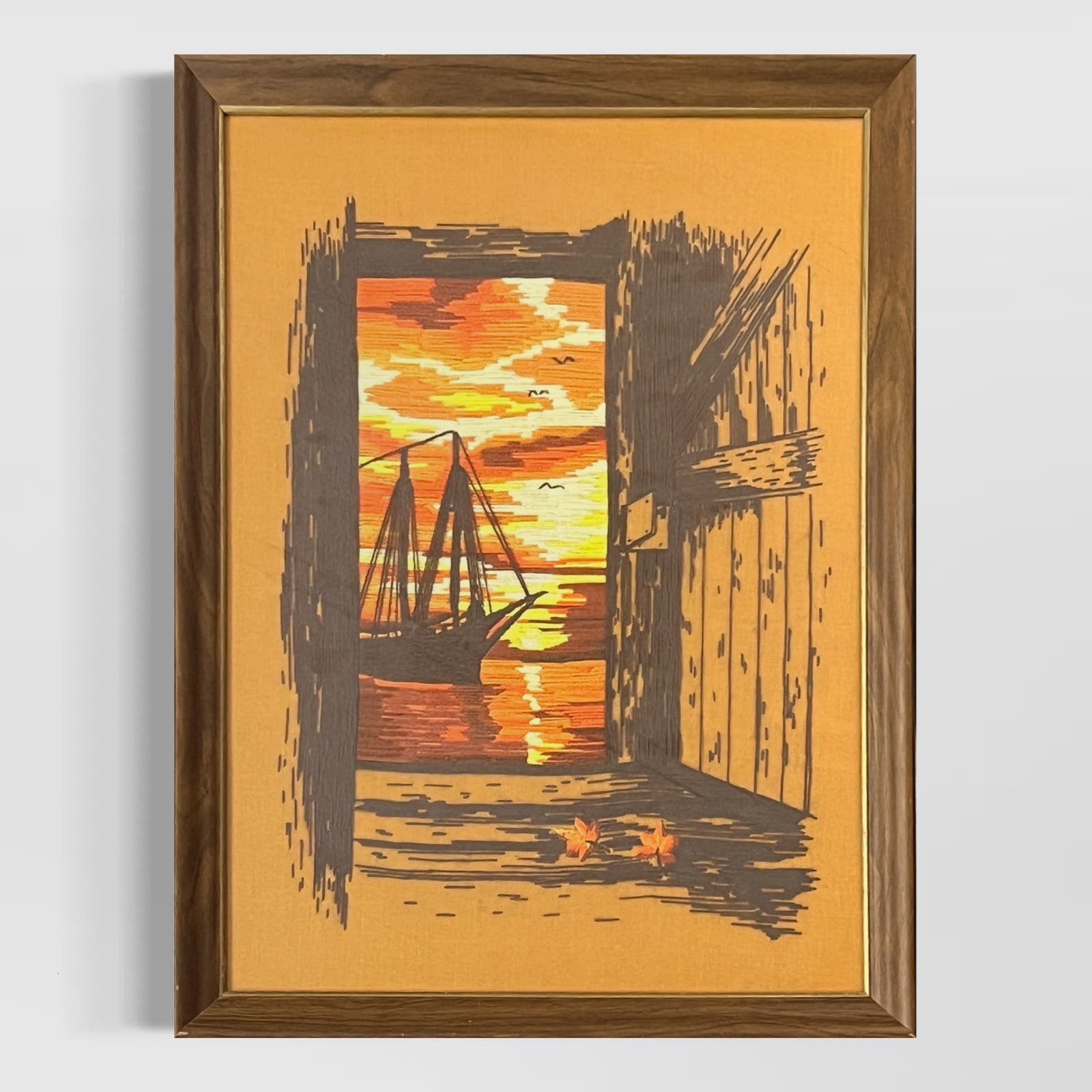 1976 Framed Crewel Embroidery Sunset Paragon Needlecraft Nautical Sailboat 20x26