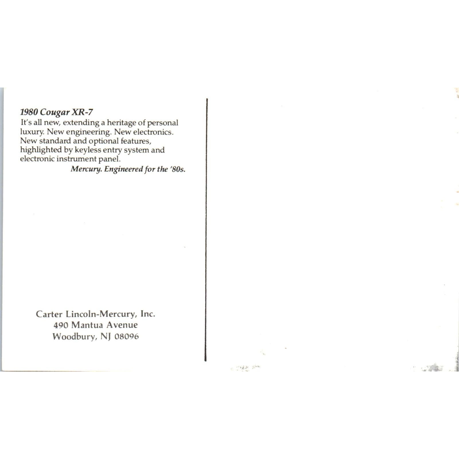 1980 Cougar XR-7 Carter Lincoln-Mercury Woodbury NJ Vintage Postcard PC11