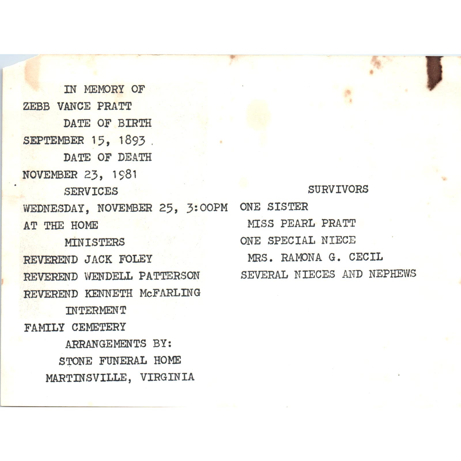 1981 Funeral Card Zebb Vance Pratt Martinsville Virginia AF1-RR2