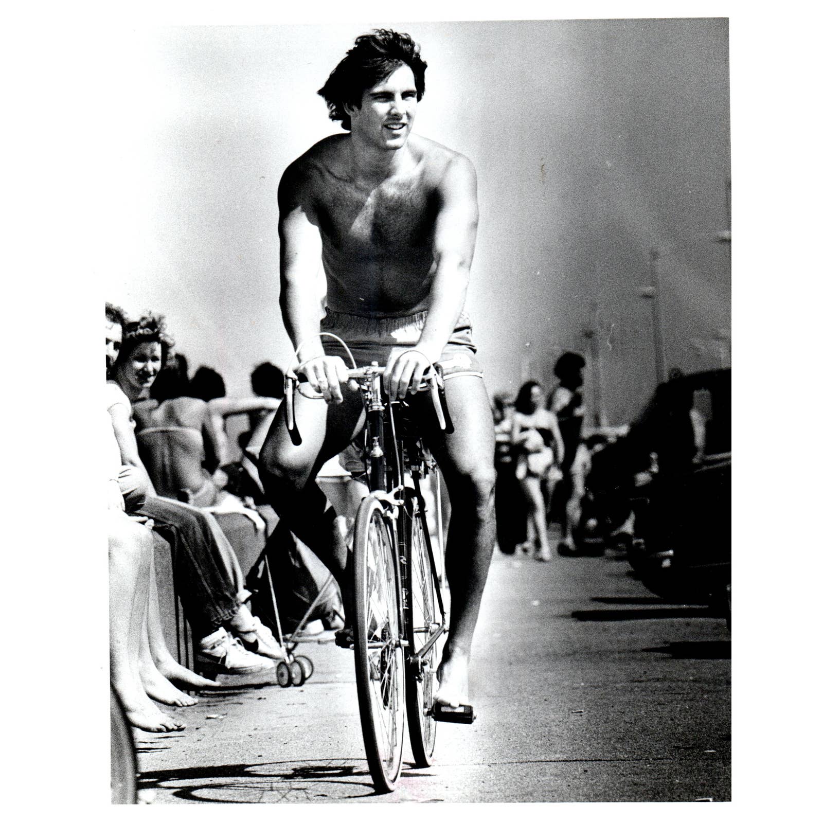 1982 Press Photo Cycling Bill Hall Bikes Down Wollaston Beach 8x10" AD3