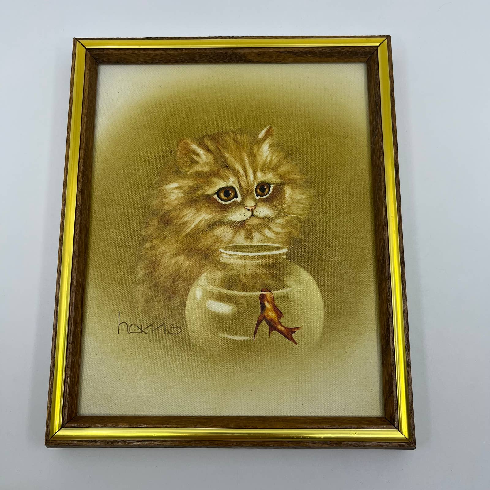 1985 Original Framed Peggy Harris Painting on Canvas Cat and Fish Bowl TG1