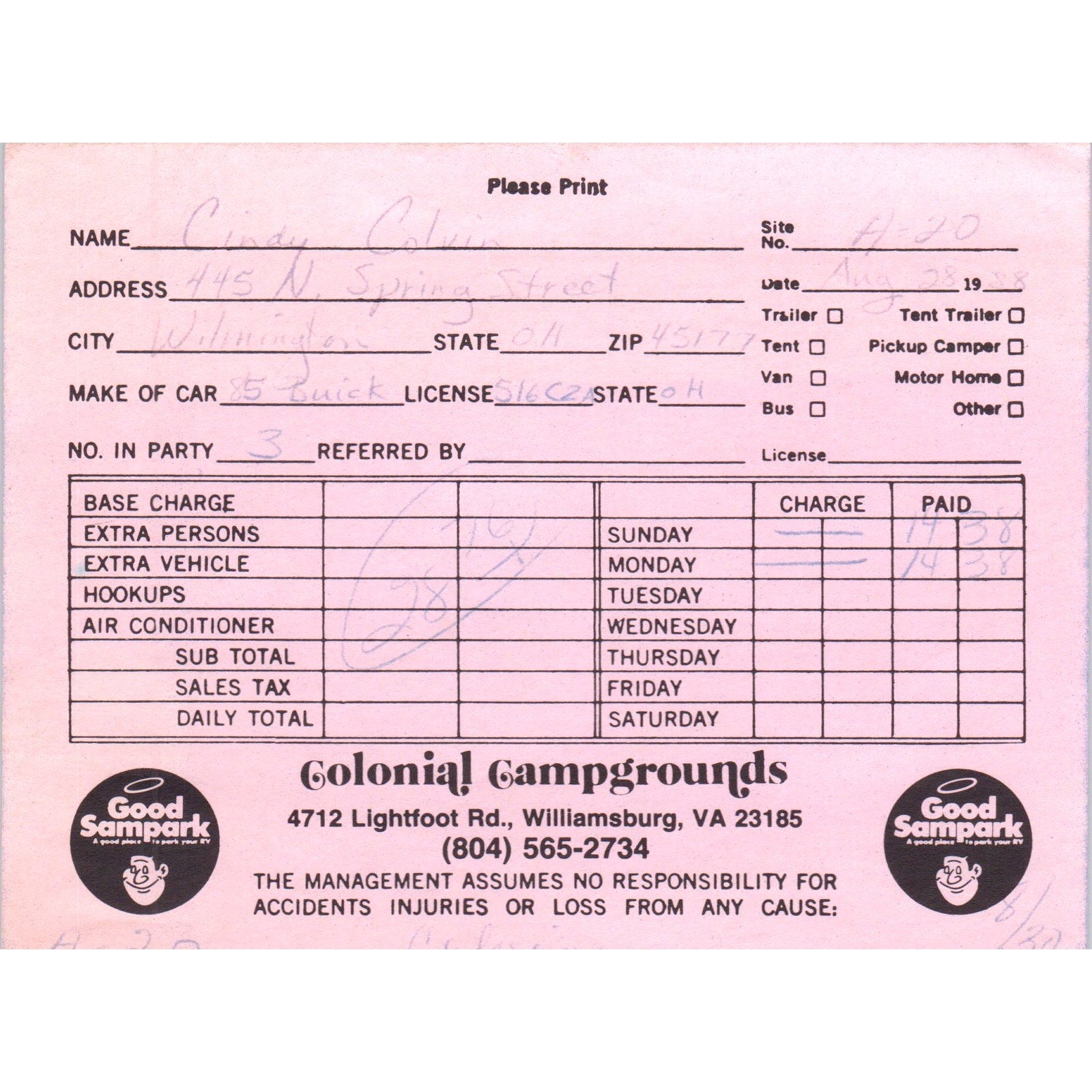 1988 Colonial Campgrounds Williamsburg VA Good Sampark Receipt AD8-R6