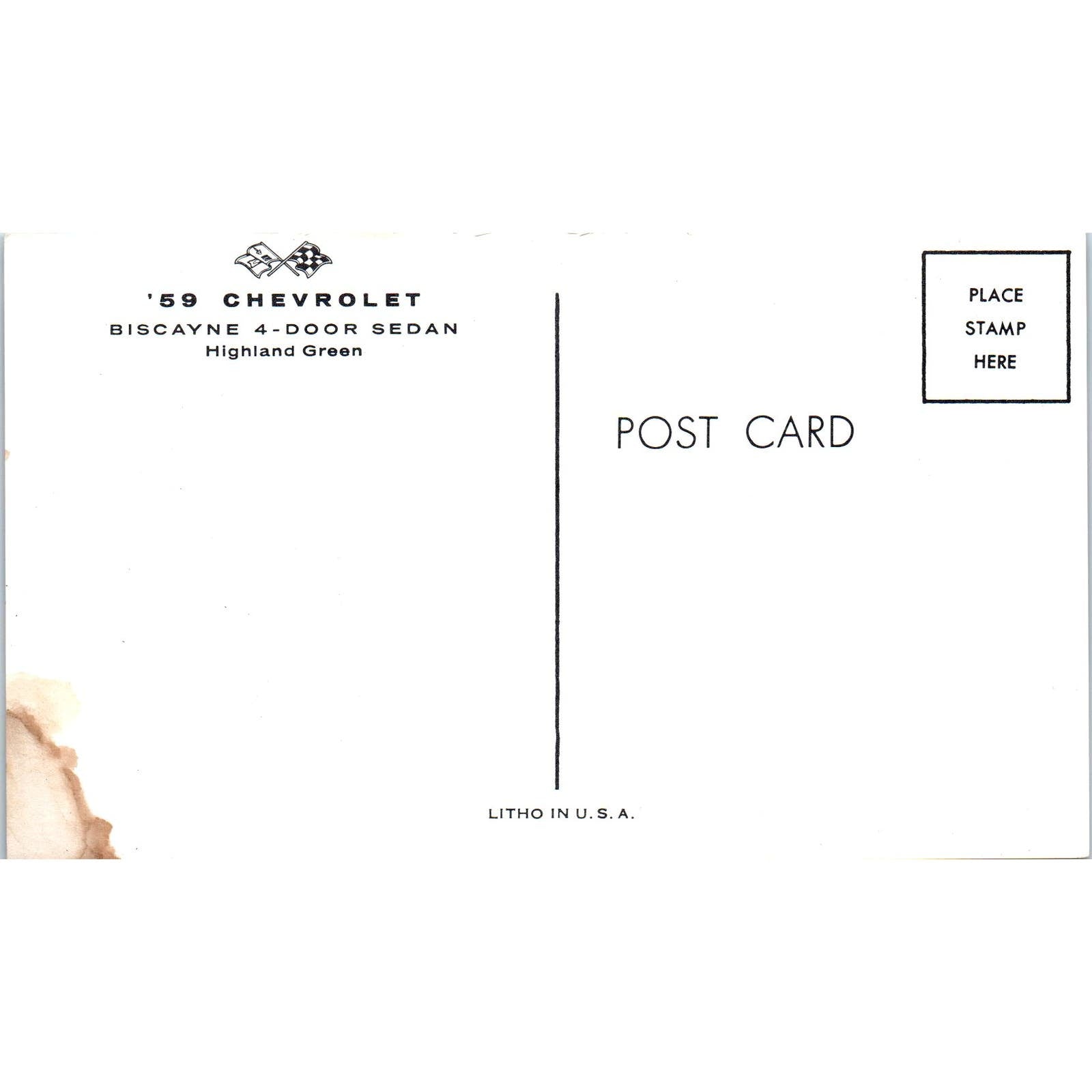 '59 Chevrolet Biscayne 4-Door Sedan Highland Green Vintage Postcard PC1