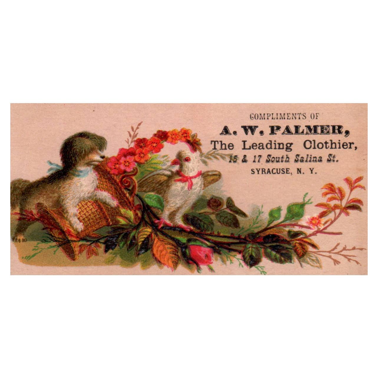 A.W. Palmer Clothier Syracuse NY Puppy Bird - 1880s Victorian Trade Card TJ8-3