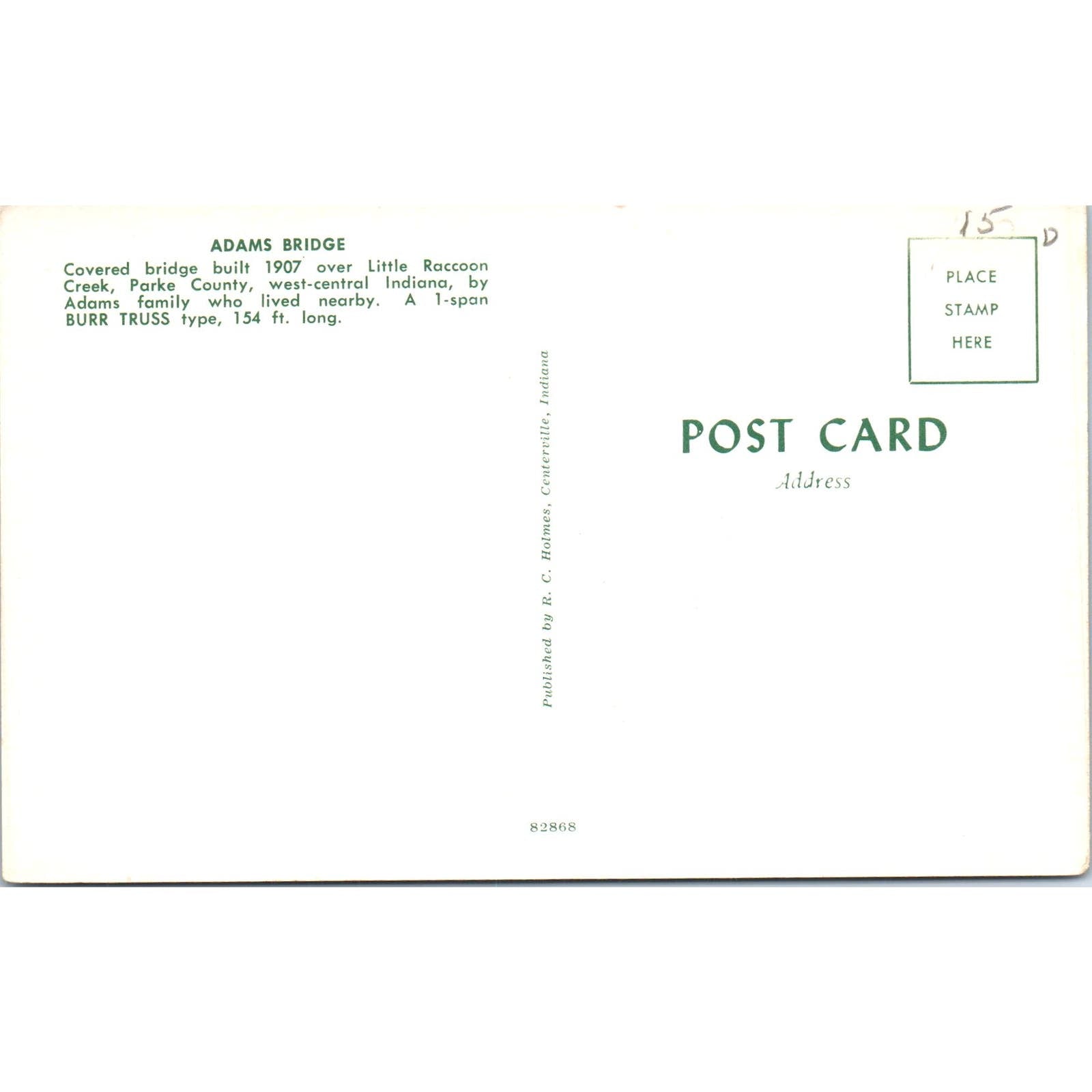 Adams Bridge Little Raccoon Creek Parke County IN Covered Bridge Postcard PC8