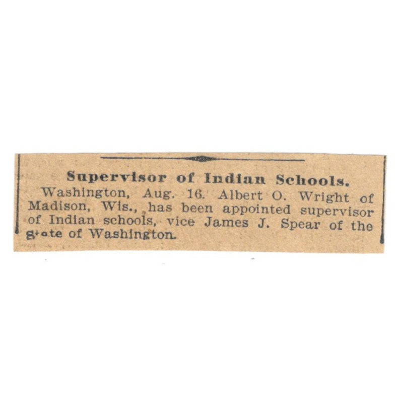 Albert O. Wright Appointed Supervisor of Indian Schools 1898 Newspaper Ad AF2-S1
