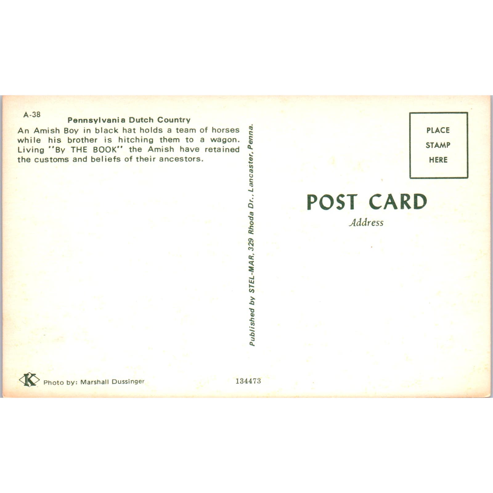 Amish Boy Holds Team of Horses Pennsylvania Dutch Country Postcard PD7