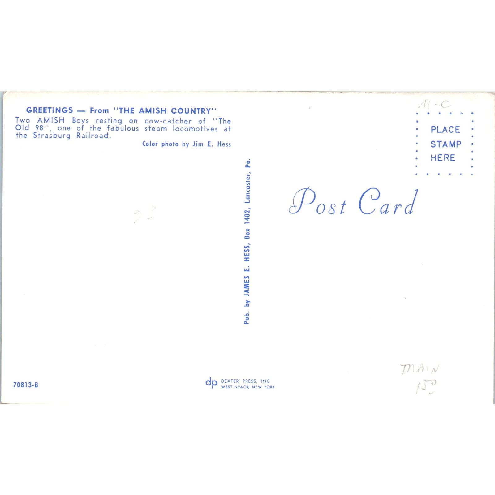 Amish Boys and Girls on Cow Catcher Strasburg Railroad PA Dutch Country Vintage Postcard PD1