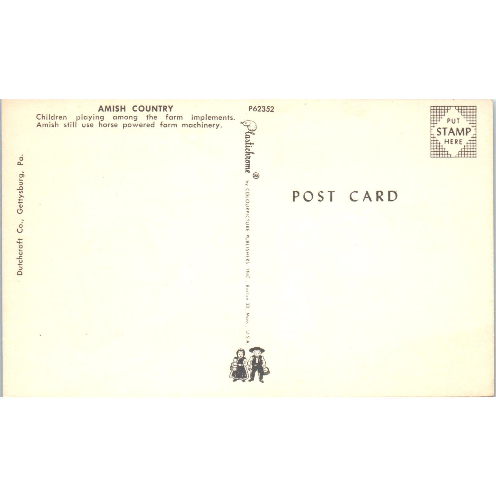 Amish Children Playing Among Farm Equipment Pennsylvania Dutch Country Postcard PD8