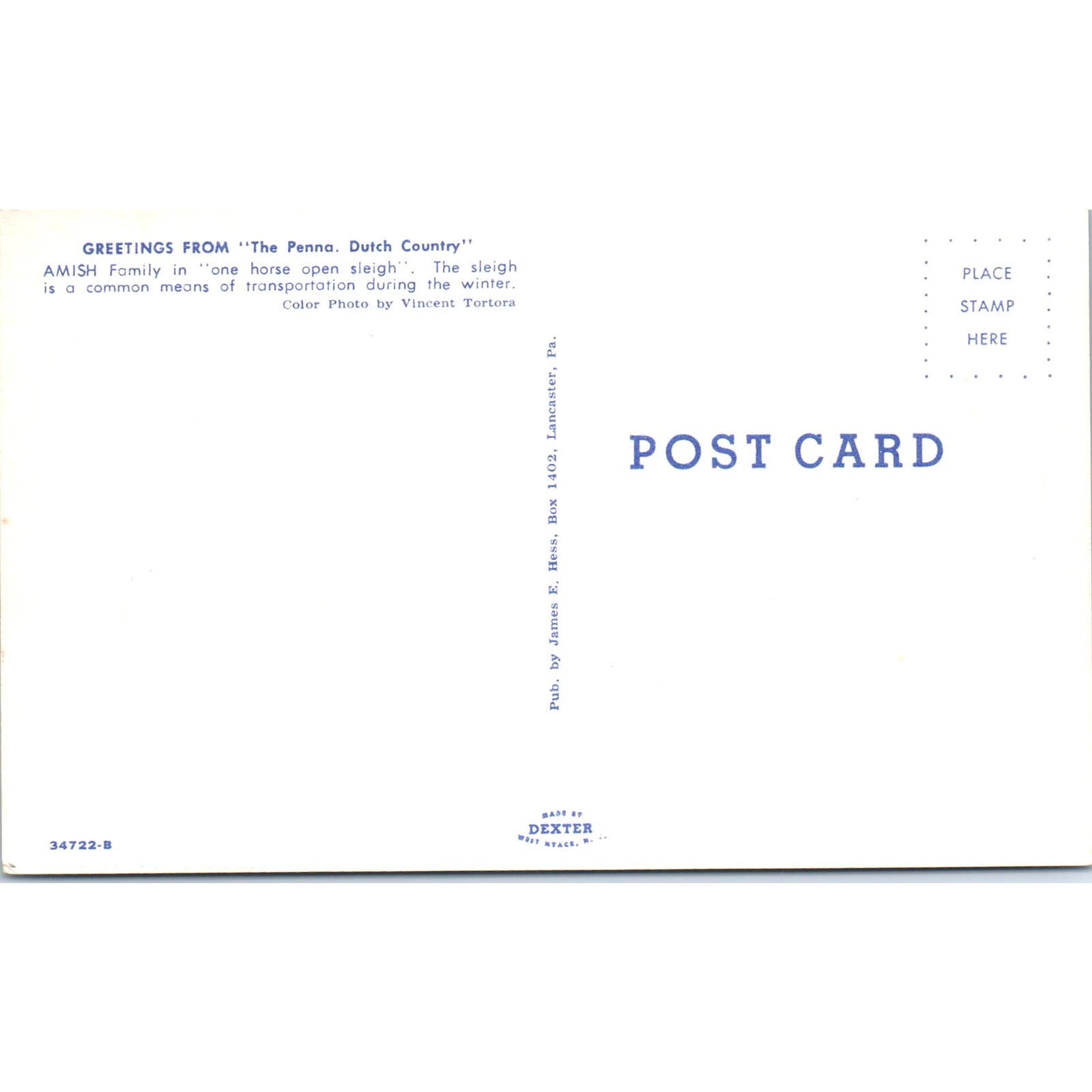 Amish Family in One Horse Open Sleigh Pennsylvania Dutch Country Postcard PD8