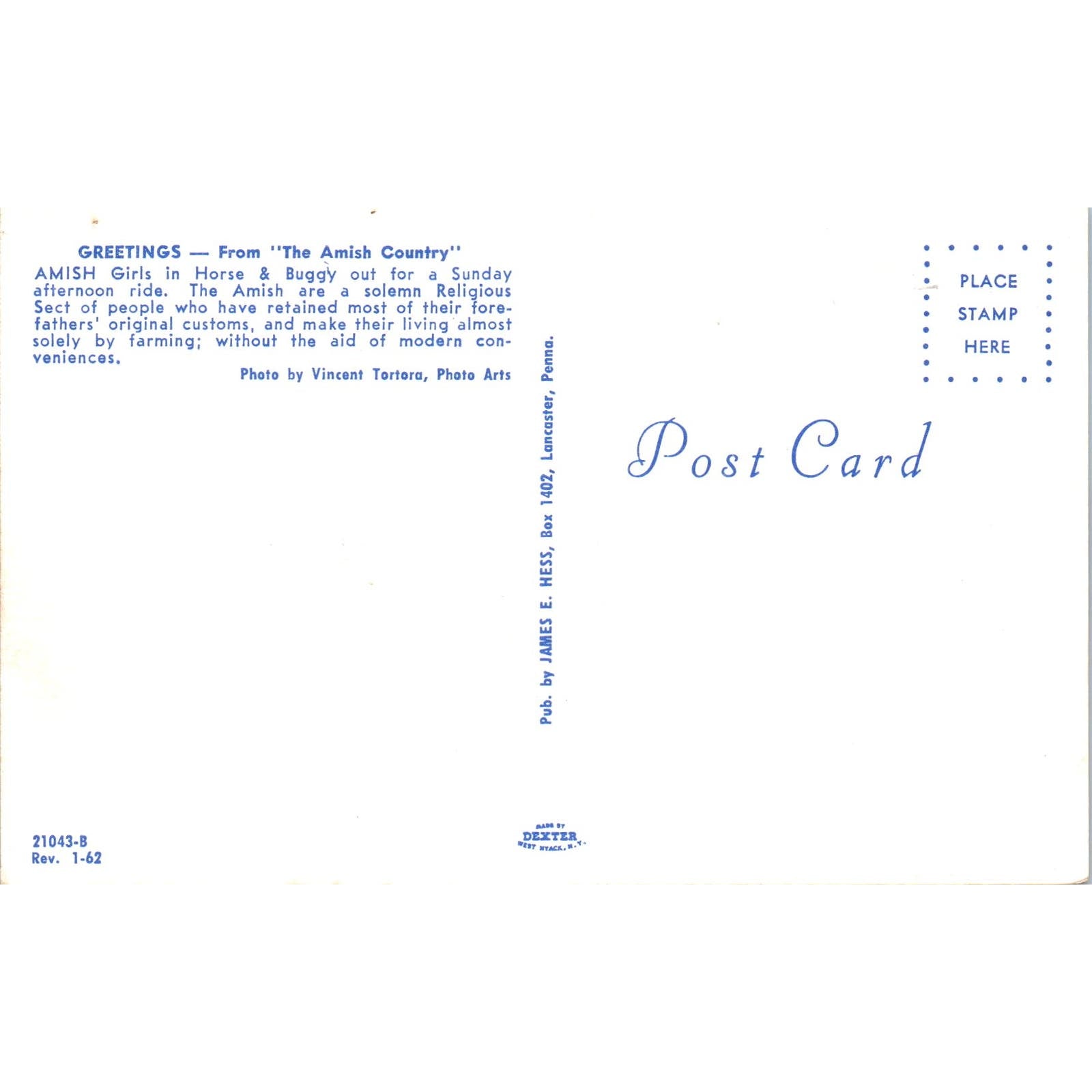 Amish Girls in Horse & Buggy Pennsylvania Dutch Country Postcard PD8