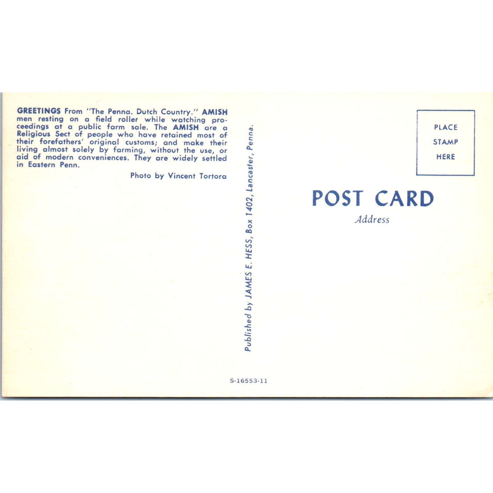 Amish Men on a Field Roller at Public Farm Sale PA Dutch Vintage Postcard PD4