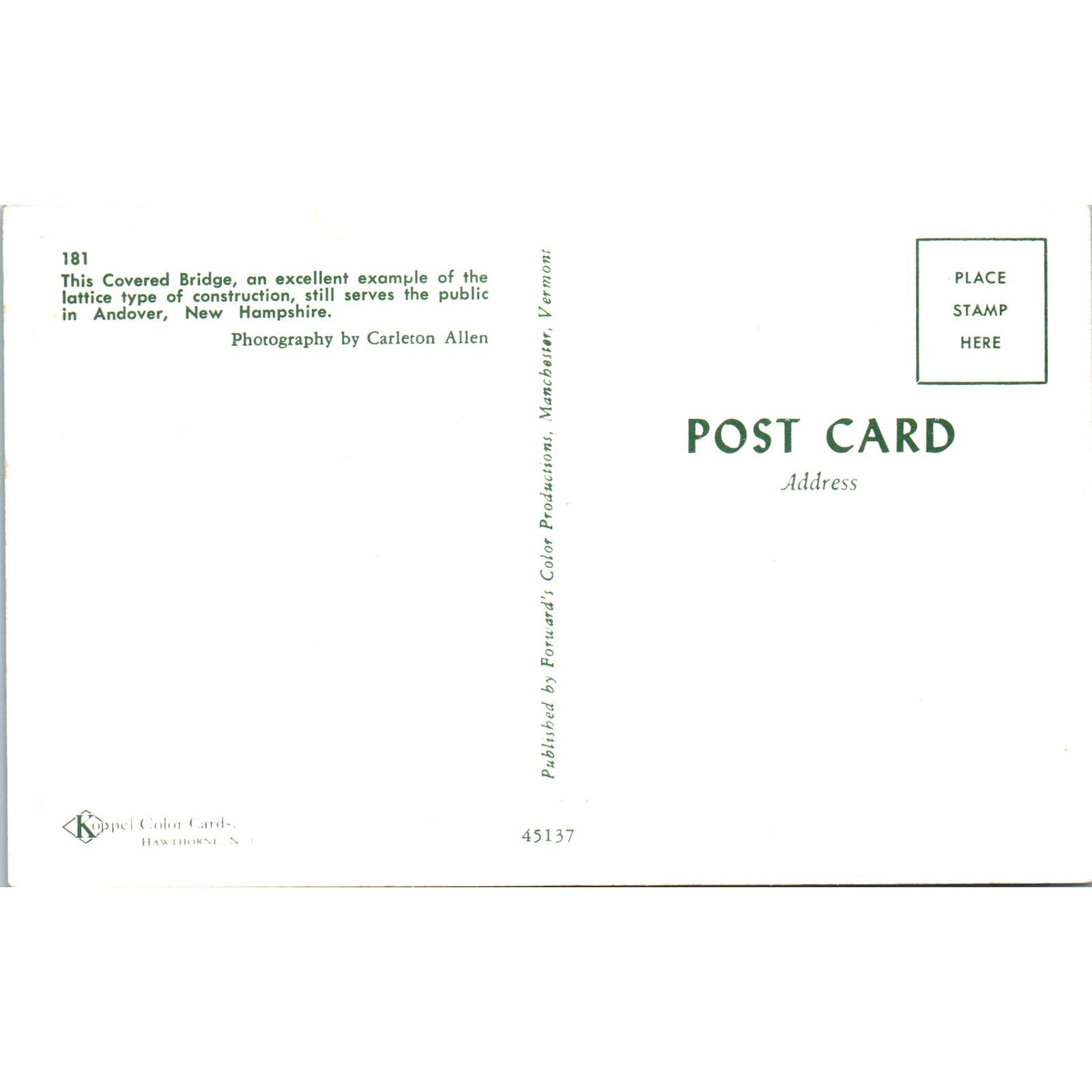 Andover New Hampshire Covered Bridge Postcard PC7
