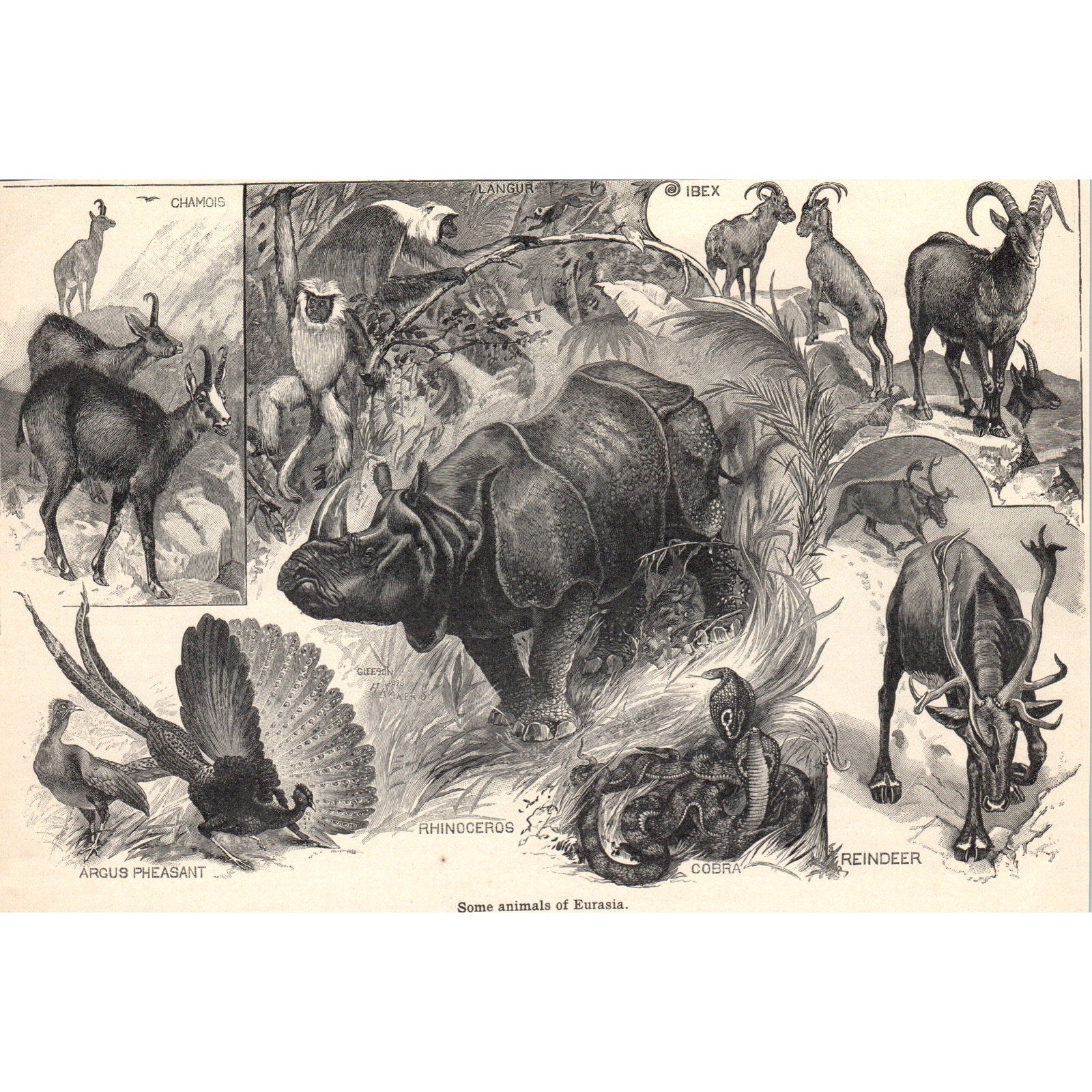 Animals of Eurasia Rhino Chamois Ibex Cobra Langur 1901 Engraving AF2-A6