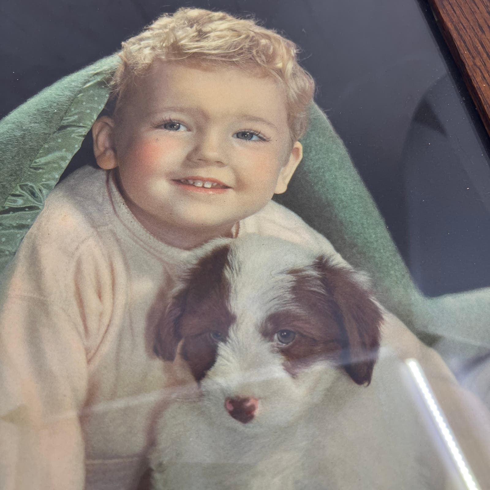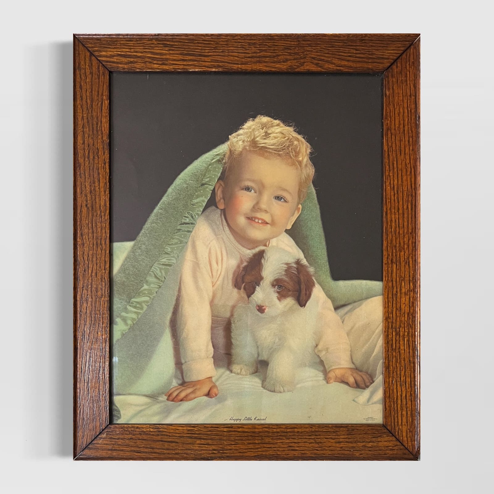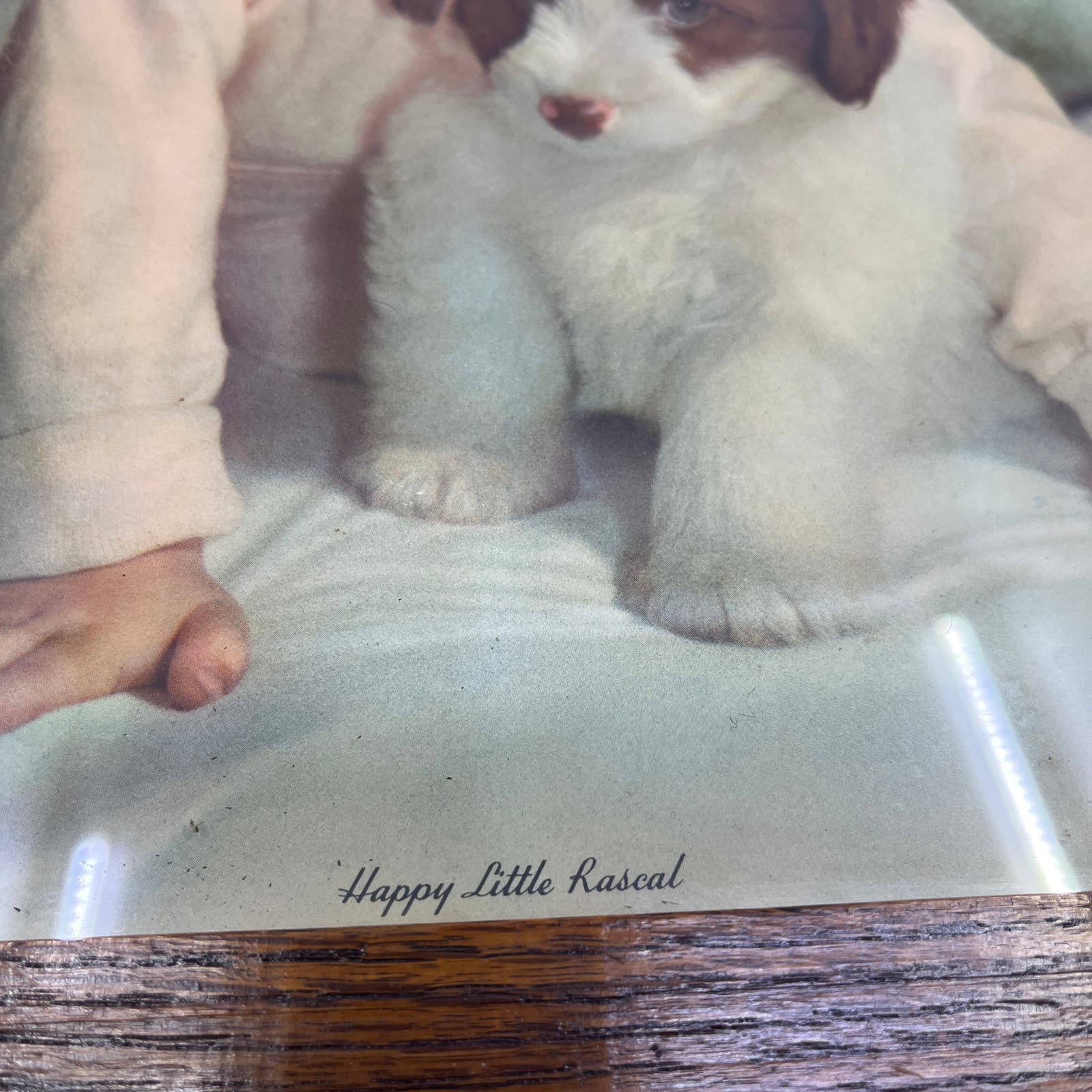 Antique Kitschy Framed Wall Art Print Happy Little Rascal Boy With Puppy Nursery