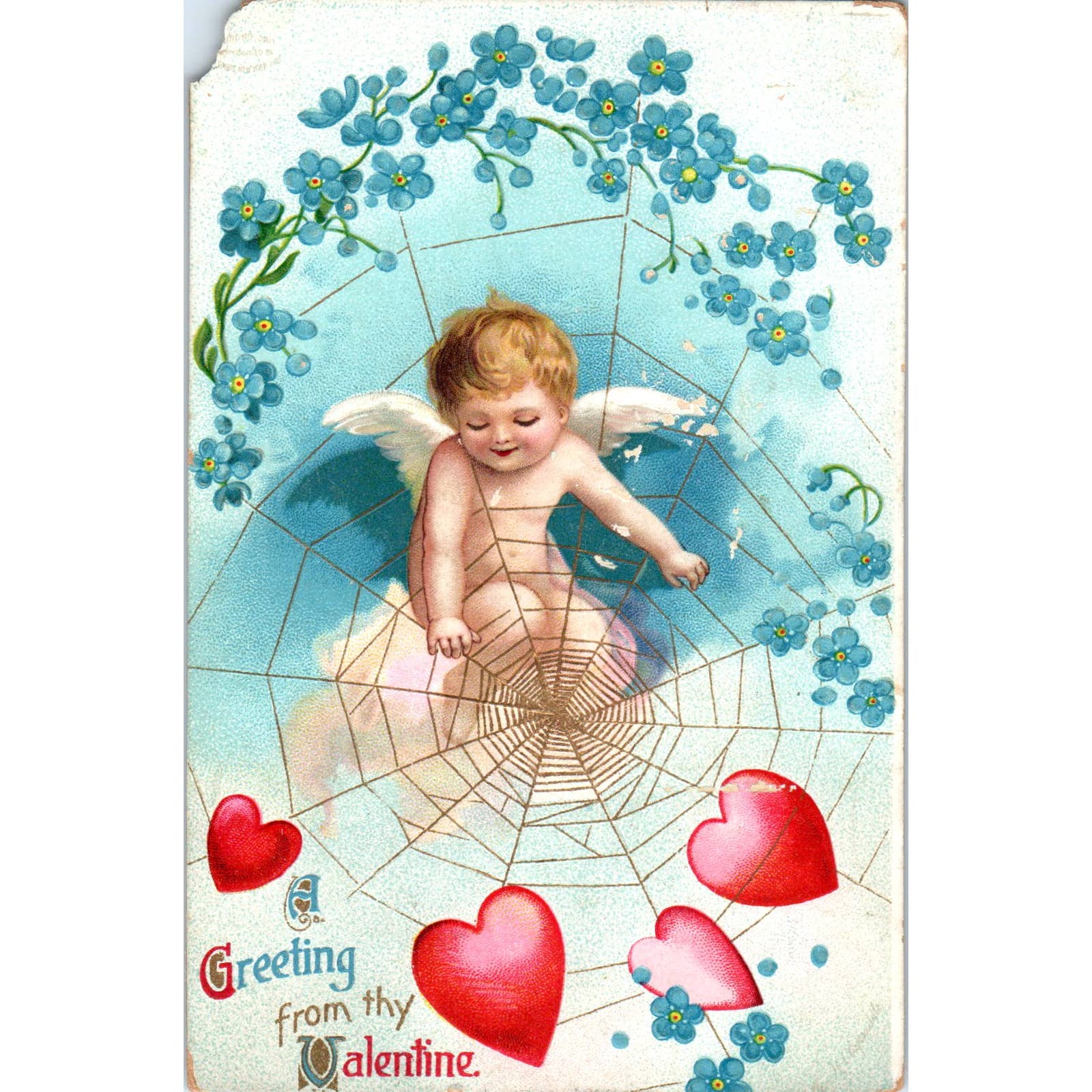Antique Postcard Valentines Day Cupid in Spider Web Embossed SF2