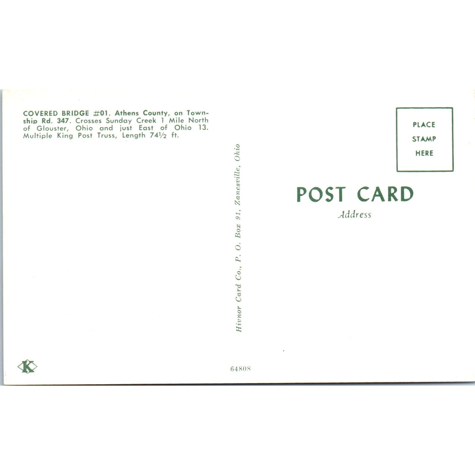 Athens County #1 Sunday Creek Glouster Ohio Covered Bridge Postcard PC1
