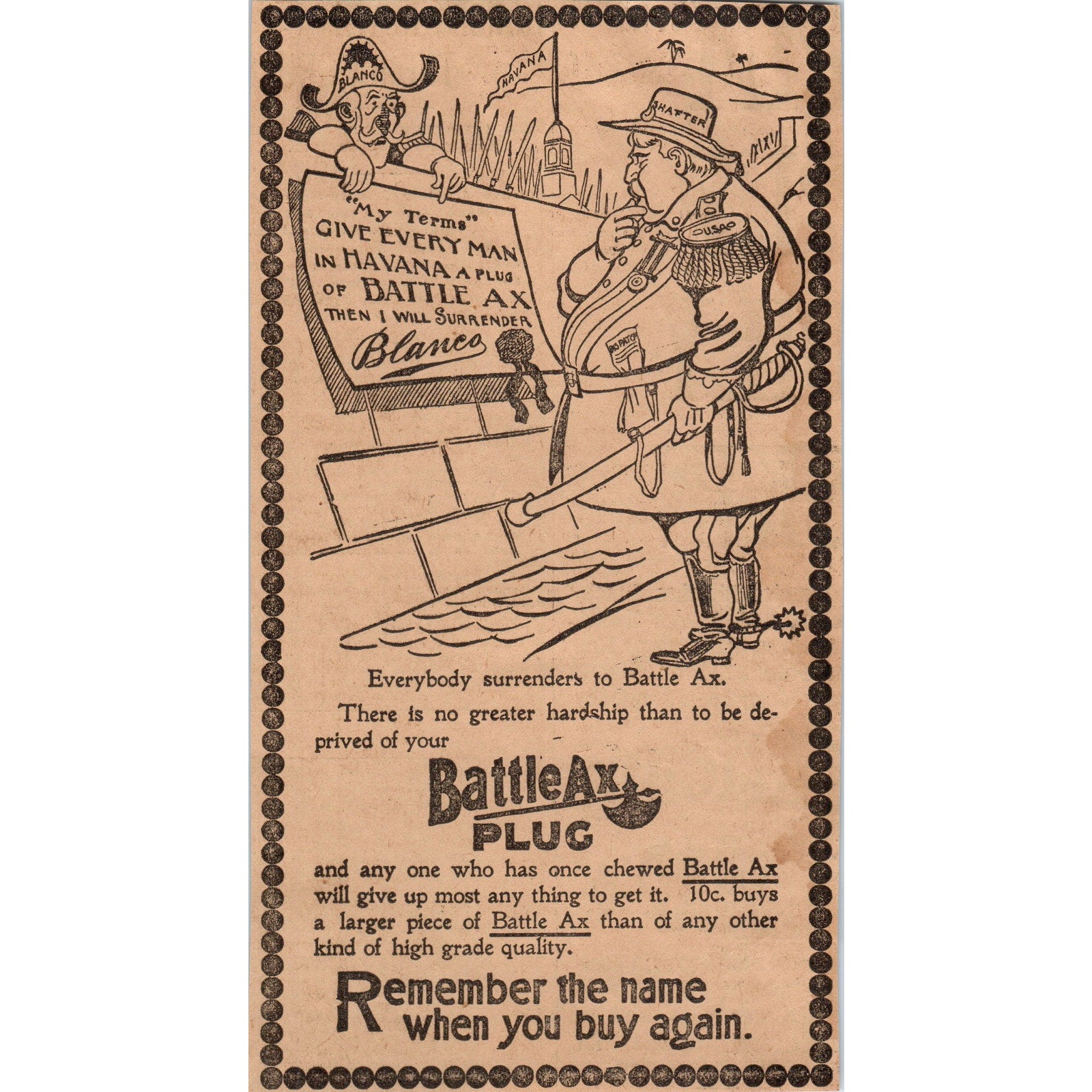 Battle Ax Plug Spanish American War Political Cartoon Blanco Shafter 1898 Newspaper Ad AF2-A2