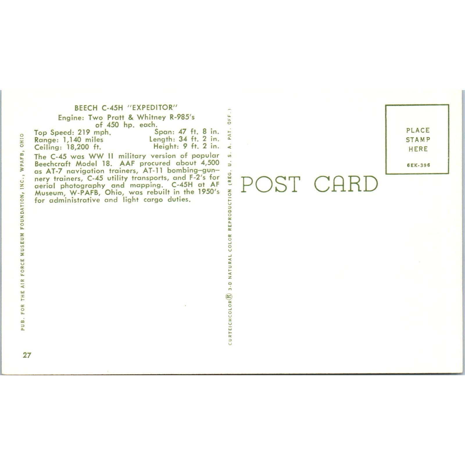 Beech C-45H Expeditor Vintage Postcard TG8-PC
