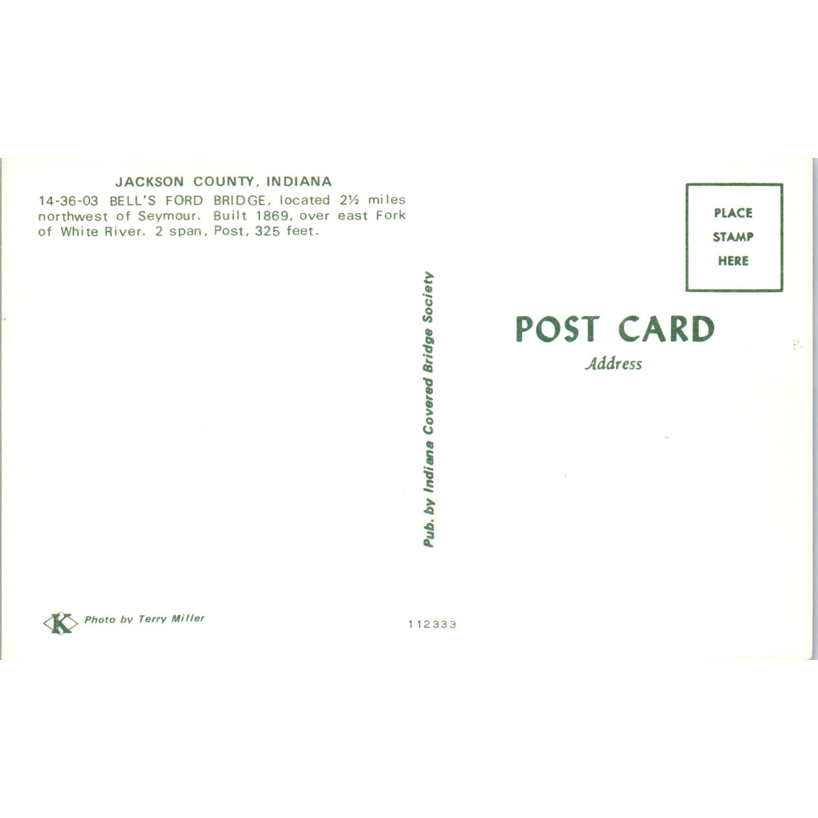 Bell's Ford Bridge Jackson County Indiana Covered Bridge Postcard PB11