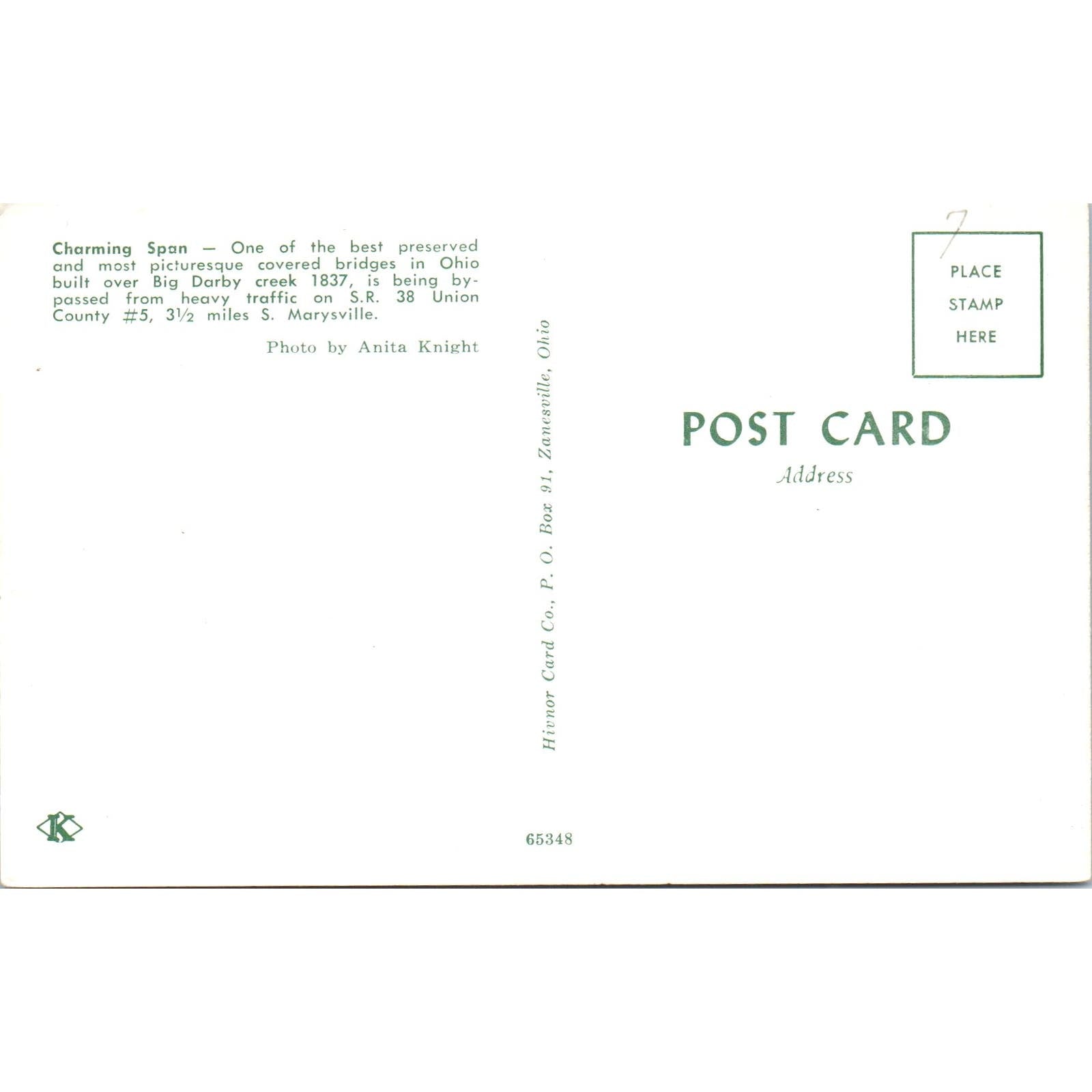 Big Ohio Creek Bridge Marysville OH Vintage Covered Bridge Postcard PD6