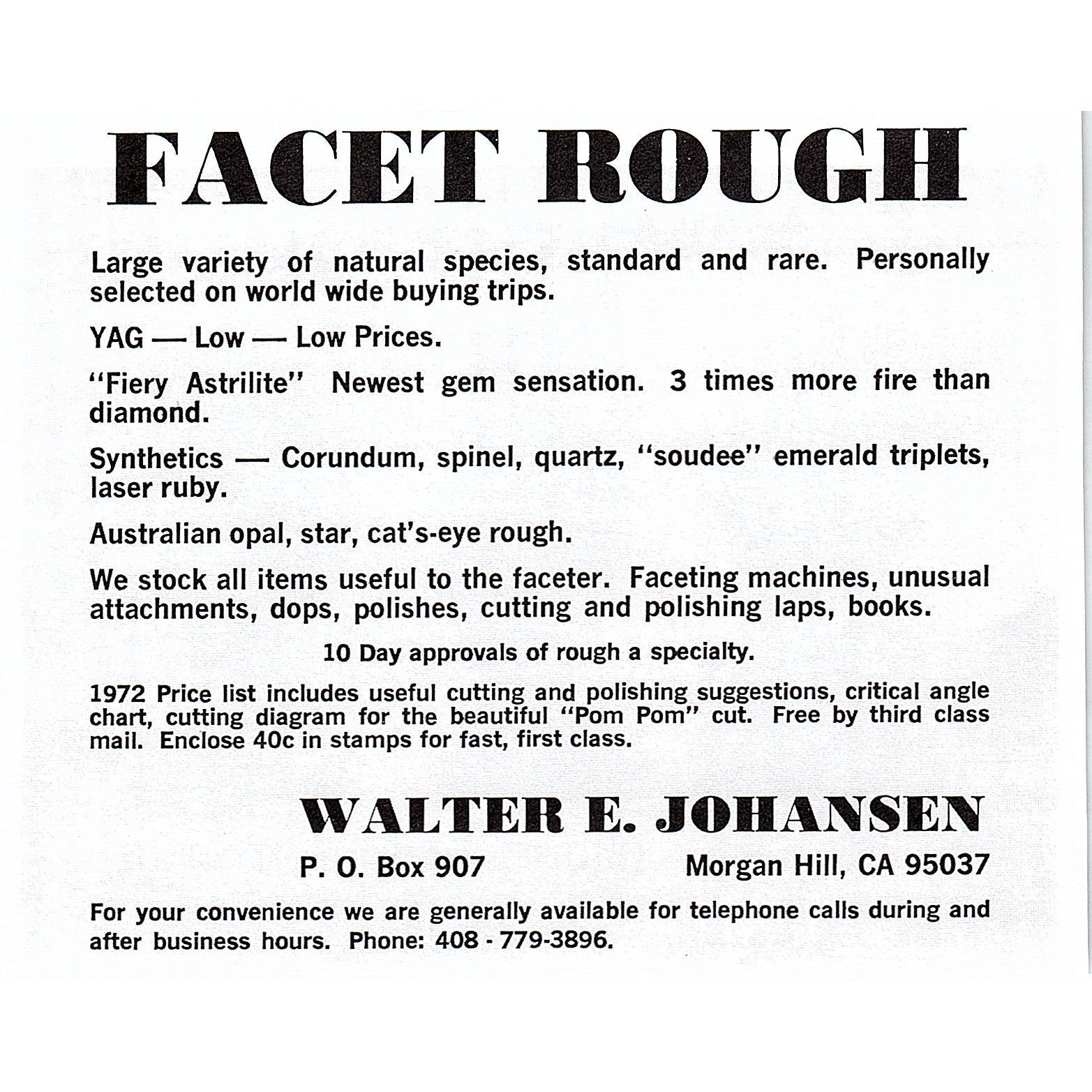 Measures approx 4x5". This is a SMALL Ad, size is approximate. Original piece taken from a 1972 Lapidary Journal magazine. Has regular wear and tear you would expect from a piece this age. See pics for condition.