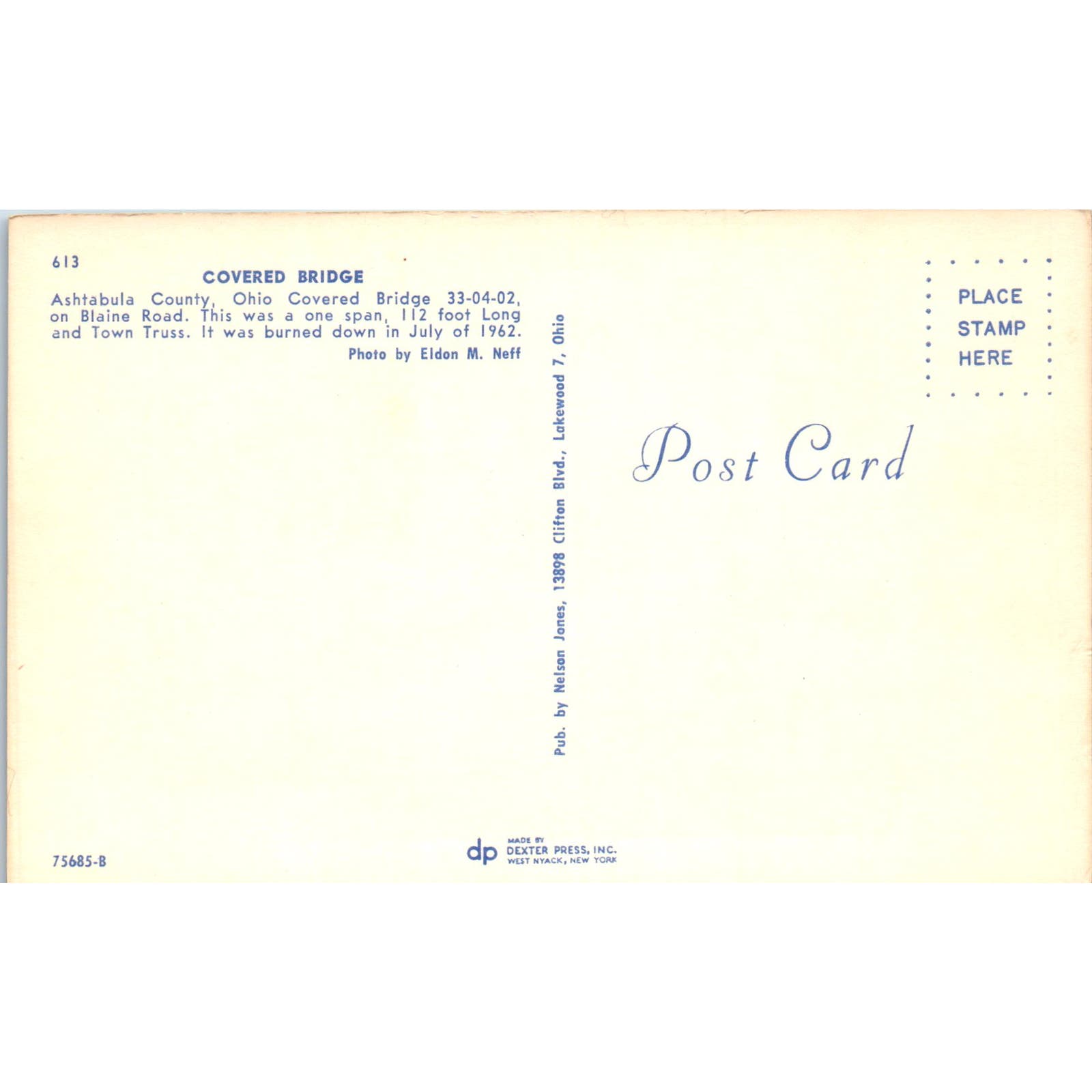 Blaine Road Bridge Ashtabula County Ohio Covered Bridge Postcard PC2