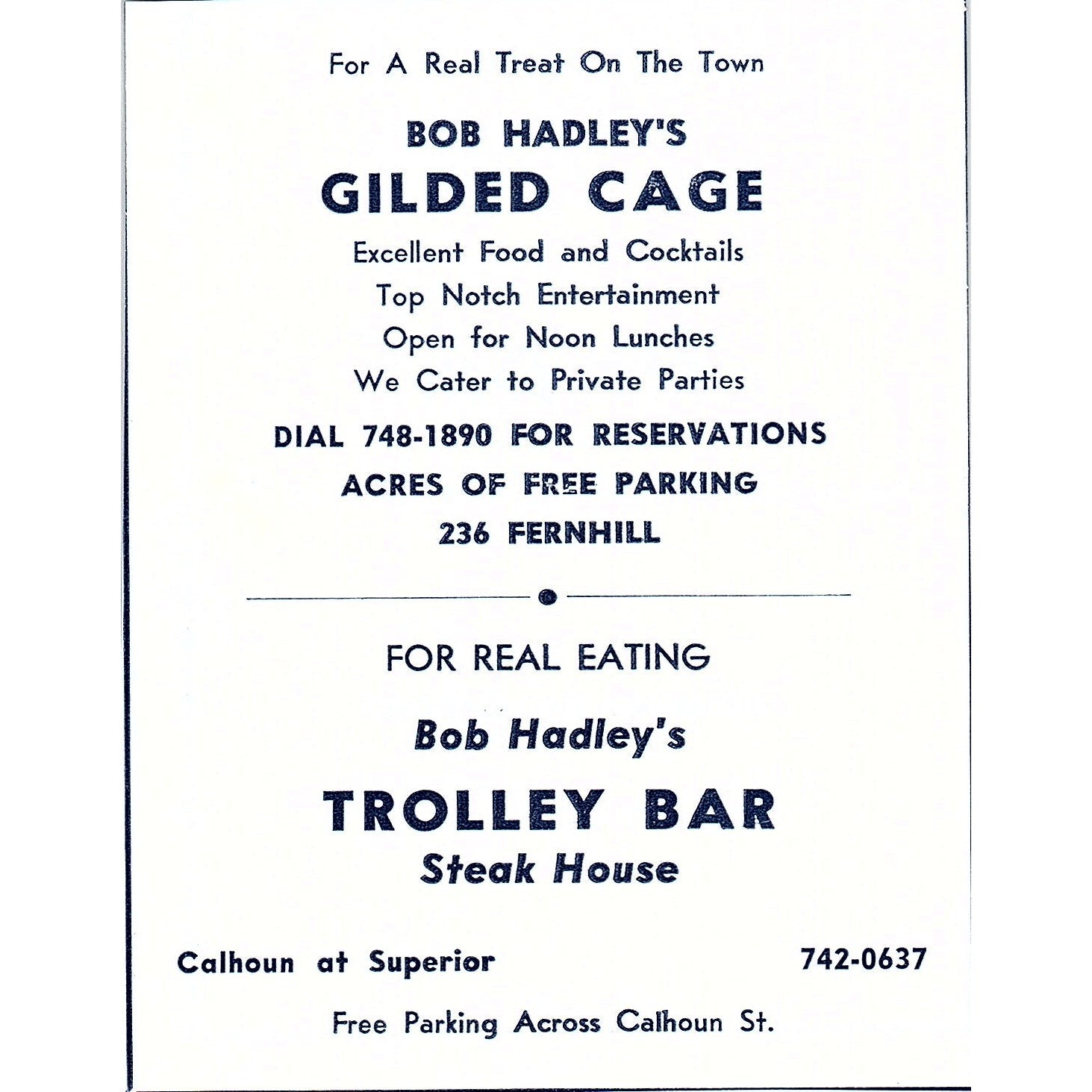 Bob Hadley's Gilded Cage, Trolly Bar Restaurant Fort Wayne Indiana 1964 Ad AG1-9