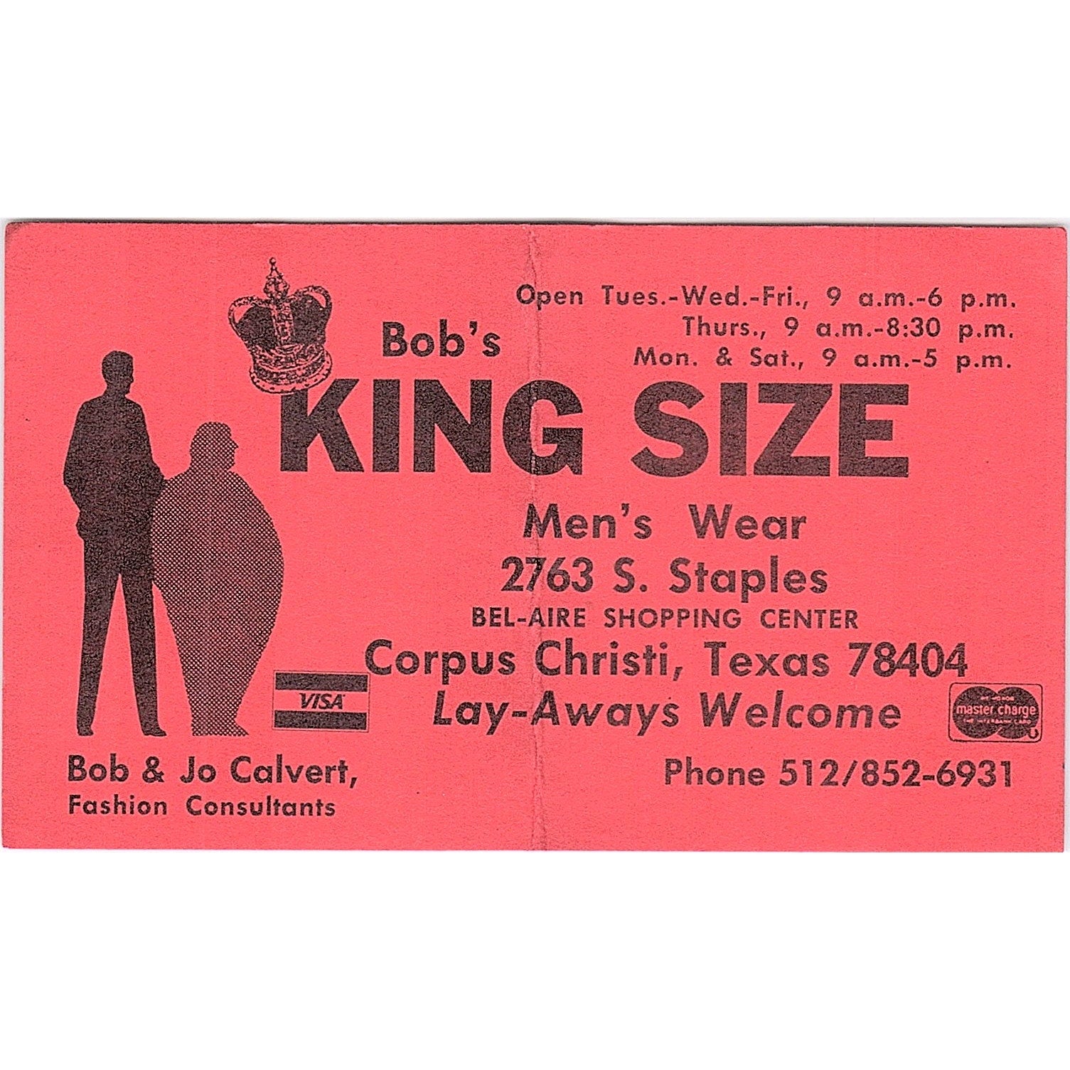 Bob's King Size Men's Wear Bob & Jo Calvert Corpus Christi Vintage Business Card TH2-B2