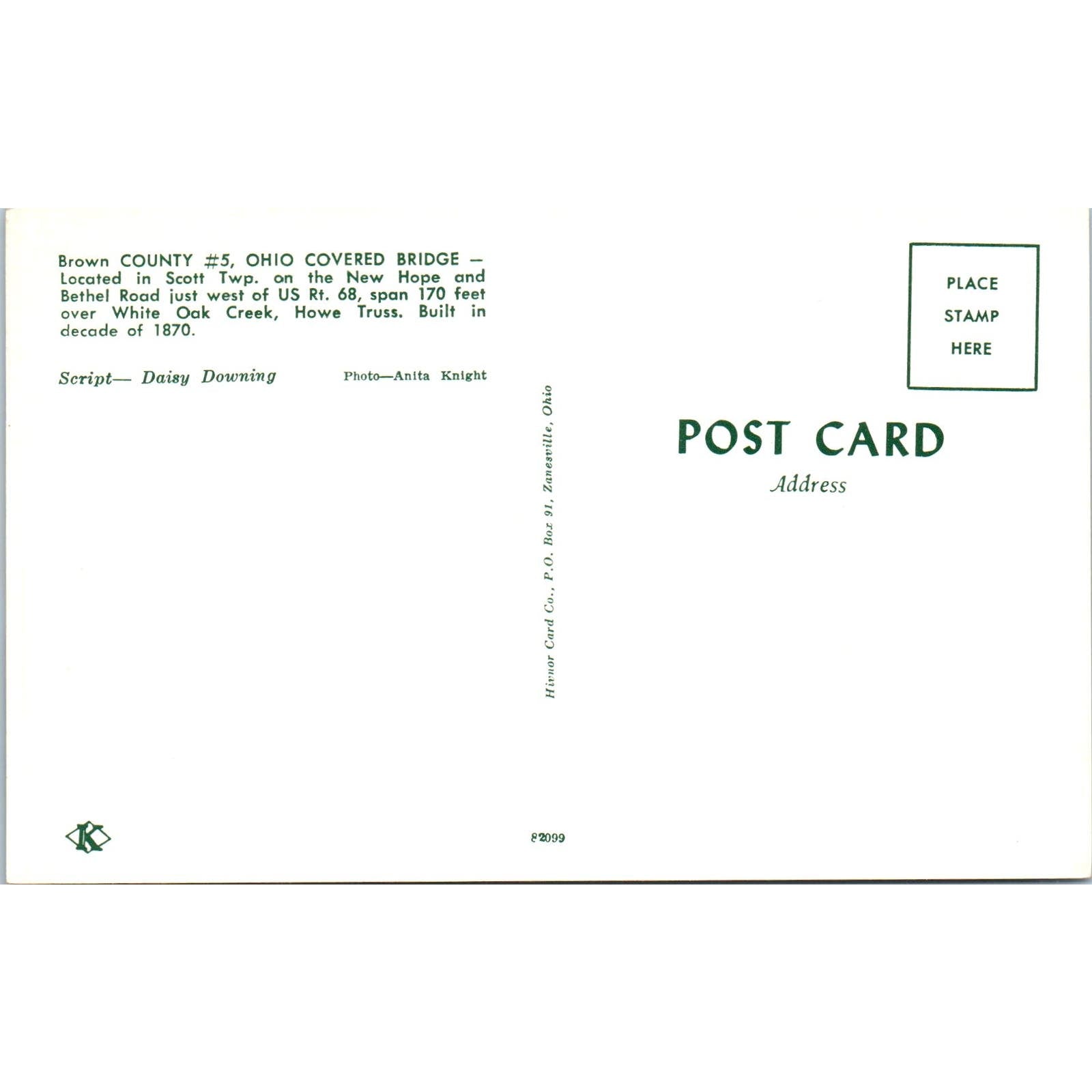 Brown County 5 Scott Twp White Oak Creek OH Vintage Covered Bridge Postcard PC13
