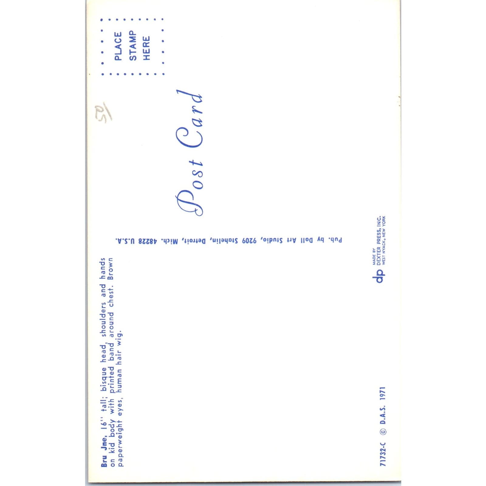 Bru Jne Bisque Head Doll Art Studio 1971 Original Postcard PB6
